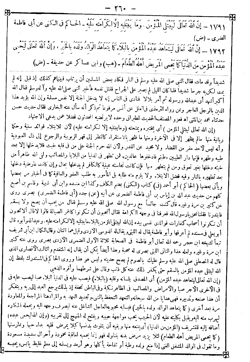 1791 - (إن الله تعالى لبتلي المؤمن) أي يختبره ويمتحنه (وما يبتليه إلا لكرامته عليه) لأن للابتلاء فوائد سنية وحكما ربانية منها ما لم يظهر إلا في الآخرة ومنها ما ظهر بالاستقراء كالنظر إلى قهر الربوبية والرجوع إلى ذل العبودية وأنه ليس لأحد مفر من القضاء ولا محيد عن القدر ولأن الله حرم الجنة على من في قلبه خبث فلا يدخلها إلا بعد طيبه وطهره فإنها دار الطيبين {وطبتم فادخلوها خالدين} فمن تطهر في الدنيا من البلايا والمصائب ولقي الله طاهرا من خبثه دخلها بغير تعوق ومن لم يتطهر منها فإن كانت نجاسته عينية كالكافر لم يدخلها بحال وإن كانت عارضية دخلها بعد تطهيره بالنار وفيه فضل الابتلاء ولا يلزم منه طلبه بل المأمور به طلب العفو والعافية كما في أخبار مر بعضها ويأتي بعضها (الحاكم) أبو أحمد (في) كتاب (الكنى) بضم الكاف وكذا ابن منده وابن أبي شيبة وقاسم بن أصبع كلهم من حديث عبد الله بن إياس بن أبي فاطمة الضمري عن أبيه (عن) جده (أبي فاطمة الضمري) بصري روى عن كثير بن مرة وغيره قال: كنت جالسا مع رسول الله صلى الله عليه وسلم فقال: من يحب أن يصح ولا يسقم فابتدرنا فقلنا: نحن يا رسول الله فعرفنا في وجهه الكراهة فقال: أتحبون أن تكونوا كالحمر الصيالة قالوا: لا قال: ألا تحبون أن تكونوا أصحاب كفارات فوالذي نفسي بيده إن الله ليبتلي المؤمن بالبلاء ما يبتليه إلا لكرامته عليه وعبد الله وأبوه قال أبو يعلى في مسنده لم أعرفها وأبو فاطمة يقال له الليثي ويقال له الدوسي الأزدي وقيل هما اثنان وقال الكمال بن أبي شريف تبعا لشيخه ابن حجر رحمه الله تعالى أبو فاطمة في الصحابة ثلاثة الأول الضمري الأزدي بصري روى عنه كثير بن مرة وغيره ولعله هذا والثاني الليثي بصري له صحبة وهذا أيضا يمكن أن يقال إنه المتقدم والثالث الأنصاري الذي قال له المصطفى صلى الله عليه وسلم عليك بالصوم لم يصح حديثه وليس هو هذا وروى الحاكم في المستدرك بلفظ إن الله ليبتلي عبده المؤمن بالسقم حتى يكفر ذلك عنه كل ذنب وقال على شرطهما وأقره الذهبي