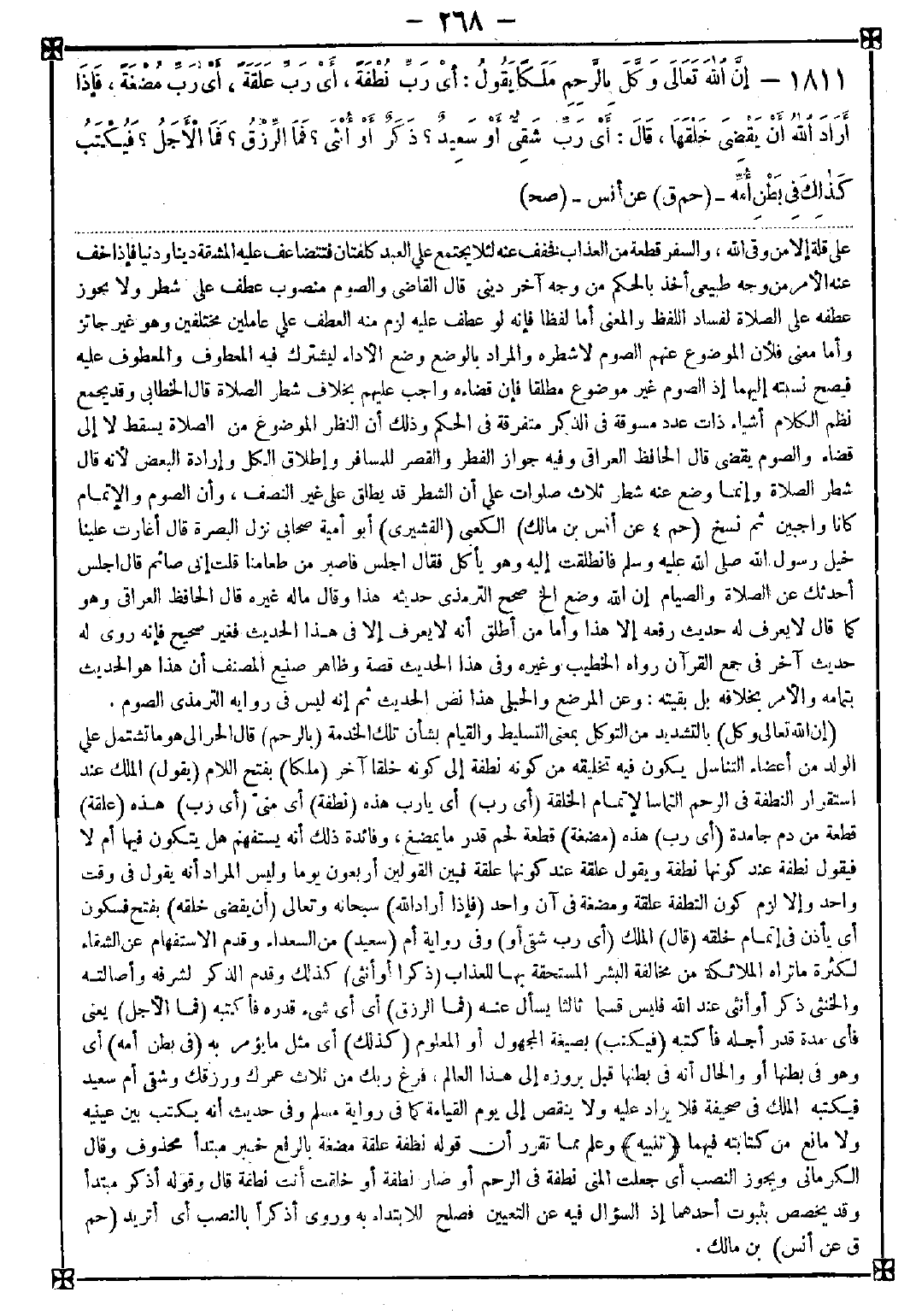 1811 - (إن الله تعالى وكل) بالتشديد من التوكل بمعنى التسليط والقيام بشأن تلك الخدمة (بالرحم) قال الحرالي: هو ما تشتمل على الولد من أعضاء التناسل يكون فيه تخليقه من كونه نطفة إلى كونه خلقا آخر (ملكا) بفتح اللام (يقول) الملك عند استقرار النطفة في الرحم التماسا لإتمام الخلقة (أي رب) أي يا رب هذه (نطفة) أي مني (أي رب) هذه (علقة) قطعة من دم جامدة (أي رب) هذه (مضغة) قطعة لحم قدر ما يمضغ وفائدة ذلك أنه يستفهم هل يتكون فيها أم لا فيقول نطفة عند كونها نطفة ويقول علقة عند كونها علقة فبين القولين أربعون يوما وليس المراد أنه يقول في وقت واحد وإلا لزم كون النطفة علقة ومضغة في آن واحد (فإذا أراد الله) سبحانه وتعالى (أن يقضي خلقه) بفتح فسكون أي يأذن في إتمام خلقه (قال) الملك (أي رب شقي أو) وفي رواية أم (سعيد) من السعداء وقدم الاستفهام عن الشفاء لكثرة ما تراه الملائكة من مخالفة البشر المستحقة بها للعذاب (ذكرا أو أنثى) كذلك وقدم الذكر لشرفه وأصالته والخنثى ذكر أو أنثى عند الله فليس قسما ثالثا يسأل عنه (فما الرزق) أي أي شيء قدره فأكتبه (فما الأجل) يعني فأي مدة قدر أجله فأكتبه (فيكتب) بصيغة المجهول أو المعلوم (كذلك) أي مثل ما يؤمر به (في بطن أمه) أي وهو في بطنها أو والحال أنه في بطنها قبل بروزه إلى هذا العالم فرغ ربك من ثلاث عمرك ورزقك وشقي أم سعيد فيكتبه الملك في صحيفة فلا يزاد عليه ولا ينقص إلى يوم القيامة كما في رواية مسلم وفي حديث أنه يكتب بين عينيه ولا مانع من كتابته فيهما <تنبيه> وعلم مما تقرر أن قوله نطفة علقة مضغة بالرفع خبر مبتدأ محذوف وقال الكرماني: ويجوز النصب أي جعلت المني نطفة في الرحم أو صار نطفة أو خلقت أنت نطفة قال وقوله أذكر مبتدأ وقد يخصص بثبوت أحدهما إذ السؤال فيه عن التعيين فصلح للابتداء به وروي أذكرا بالنصب أي أتريد