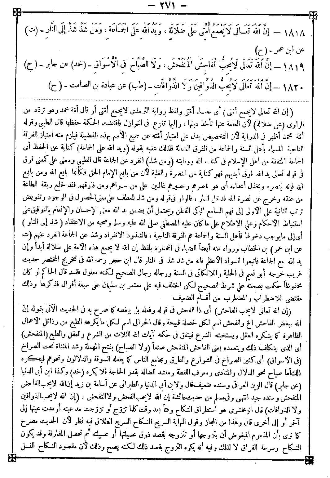 -[271]- 1818 - (إن الله تعالى لا يجمع أمتي) أي علماء أمتي ولفظ رواية الترمذي لا يجمع أمتي أو قال أمة محمد وهو تردد من الراوي (على ضلالة) لأن العامة عنها تأخذ دينها وإليها تفزع في النوازل فاقتضت الحكمة حفظها. قال الطيبي: وقوله أمة محمد أظهر في الدراية لأن التخصيص يدل على امتياز أمته عن جميع الأمم بهذه الفضيلة فيلزم منه امتياز الفرقة الناجية المسماة بأهل السنة والجماعة من الفرق الضالة فلذلك عقبه بقوله (ويد الله على الجماعة) كناية عن الحفظ أي الجماعة المتفقة من أهل الإسلام في كنف الله ورعايته (ومن شذ) انفرد عن الجماعة قال الطيبي: ومعنى على كمعنى فوق في قوله تعالى {يد الله فوق أيديهم} فهو كناية عن النصرة والغلبة لأن من بايع الإمام الحق فكأنما بايع الله ومن بايع الله فإنه ينصره ويخذل أعداءه أي هو ناصرهم ومصيرهم غالبين على من سواهم ومن فارقهم فقد خلع ربقة الطاعة من عنقه وخرج عن نصرة الله فدخل النار قالوا: وفي قوله ومن شذ للعطف على معنى الحصول في الوجود وتفويض ترتب الثانية على الأولى إلى فهم السامع الزكي الفطن ويحتمل لأن يضمن يد الله معنى الإحسان والإنعام بالتوفيق على استنباط الأحكام وعلى الإطلاع على ما كان عليه المصطفى صلى الله عليه وسلم وصحبه من الاعتقاد (شذ إلى النار) أي إلى ما يوجب دخولها فأهل السنة والجماعة هم الفرقة الناجية فالشذوذ الانفراد وشذ عن الجماعة انفرد عنهم