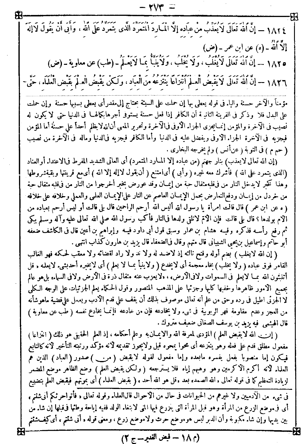 (حم ق ت عن ابن عمرو) بن العاص قال أحمد قال ذلك في حجة الوداع وفي الباب عن أبي أمامة أيضا وزاد فقال أعرابي يا نبي الله كيف يرفع العلم منا وبين أظهرنا المصاحف وقد نعلمنا ما فيها وعلمناها أبناءنا ونساءنا وخدمنا؟ فرفع رأسه وهو مغضب فقال هذه اليهود والنصارى بين أظهرهم المصاحف لم يتعلموا منها فيما جاءهم أنبياؤهم انتهى فأفاد أن بقاء الكتب بعد رفع العلم بموت العلماء لا يغني من ليس بعالم شيئا قال ابن حجر: قد اشتهر هذا الحديث من رواية هشام فوقع لنا من روايته أكثر من سبعين نفسا عنه