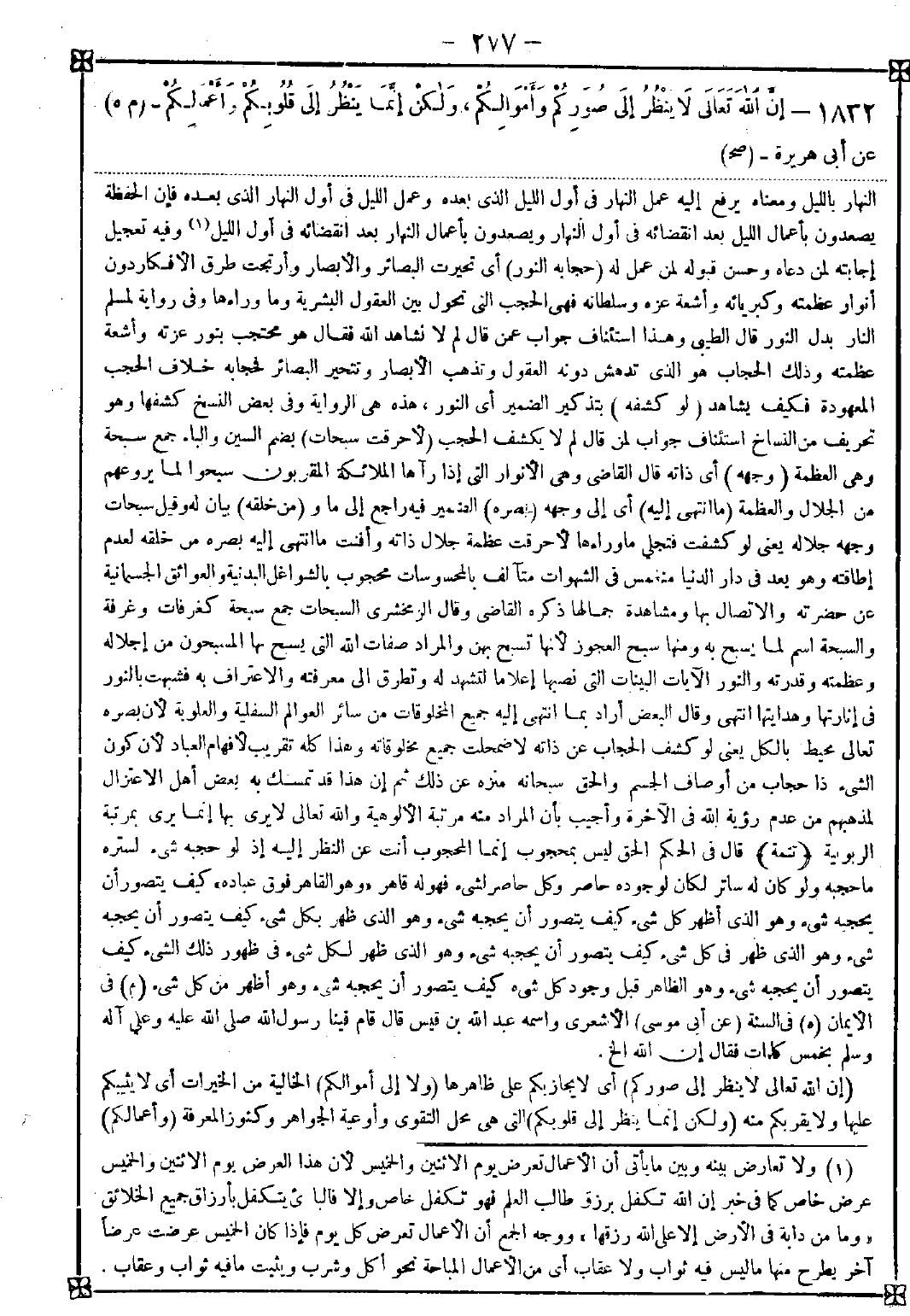 1832 - (إن الله لا ينظر إلى صوركم) أي لا يجازيكم على ظاهرها (ولا إلى أموالكم) الخالية من الخيرات أي لا يثيبكم عليها ولا يقربكم منه (ولكن إنما ينظر إلى قلوبكم) التي هي محل التقوى وأوعية الجواهر وكنوز المعرفة (وأعمالكم)