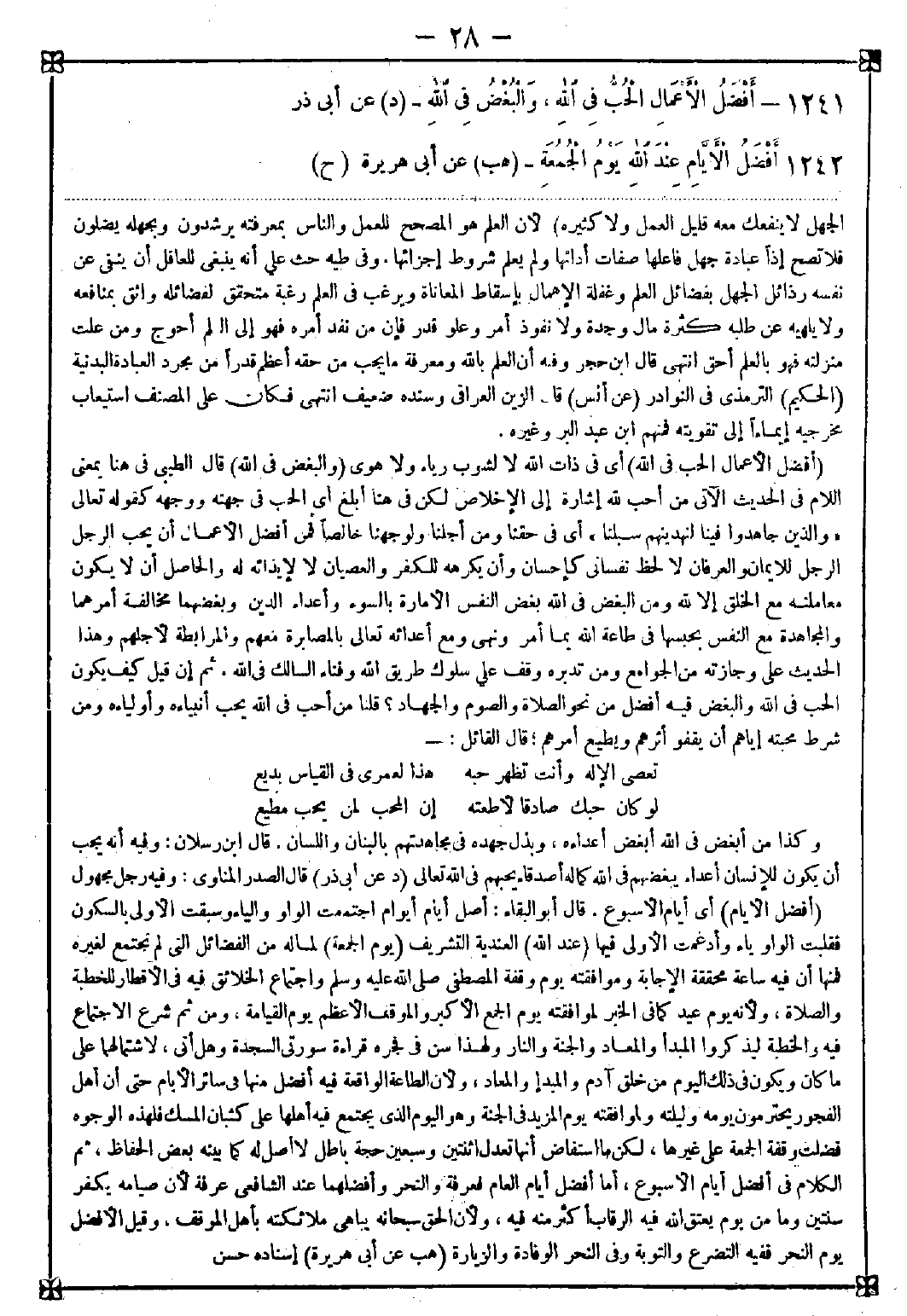 1241 - (أفضل الأعمال الحب في الله) أي في ذات الله لا لشوب رياء ولا هوى (والبغض في الله) قال الطيبي في هنا بمعنى اللام في الحديث الآتي من أحب لله إشارة إلى الإخلاص لكن في هنا أبلغ أي الحب في جهته ووجهه كقوله تعالى {والذين جاهدوا فينا لنهدينهم سبلنا} أي في حقنا ومن أجلنا ولوجهنا خالصا فمن أفضل الأعمال أن يحب الرجل الرجل للإيمان والعرفان لا لحظ نفساني كإحسان وأن يكرهه للكفر والعصيان لا لإيذائه له والحاصل أن لا يكون معاملته مع الخلق إلا لله ومن البغض في الله بغض النفس الأمارة بالسوء وأعداء الدين وبغضهما مخالفة أمرهما والمجاهدة مع النفس بحبسها في طاعة الله بما أمر ونهى ومع أعدائه تعالى بالمصابرة معهم والمرابطة لأجلهم وهذا الحديث على وجازته من الجوامع ومن تدبره وقف على سلوك طريق الله وفناء السالك في الله. ثم إن قيل كيف يكون الحب في الله والبغض فيه أفضل من نحو الصلاة والصوم والجهاد؟ قلنا من أحب في الله يحب أنبياءه وأولياءه ومن شرط محبته إياهم أن يقفوا أثرهم ويطيع أمرهم قال القائل: