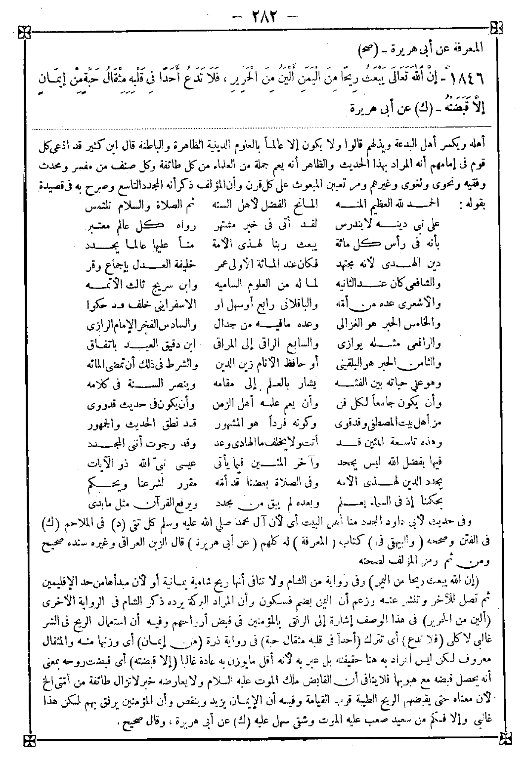1846 - (إن الله يبعث ريحا من اليمن) وفي رواية من الشام ولا تنافي أنها ريح شامية يمانية أو لأن مبدأها من حد الإقليمين ثم تصل للآخر وتنشر عنه وزعم أن اليمن بضم فسكون وأن المراد البركة يرده ذكر الشام في الرواية الأخرى (ألين من الحرير) في هذا الوصف إشارة إلى الرفق بالمؤمنين في قبض أرواحهم وفيه أن استعمال الريح في الشر غالبي لا كلي (فلا تدع) أي تترك (أحدا في قلبه مثقال حبة) في رواية ذرة (من إيمان) أي وزنها منه والمثقال معروف لكن ليس المراد به هنا حقيقته بل عبر به لأنه أقل ما يوزن به عادة غالبا (إلا قبضته) أي قبضت روحه بمعنى أنه يحصل قبضة مع هبوبها فلا ينافي أن القابض ملك الموت عليه السلام ولا يعارضه خبر لا تزال طائفة من أمتي إلخ لأن معناه حتى يقبضهم الريح الطيبة قرب القيامة وفيه أن الإيمان يزيد وينقص وأن المؤمنين يرفق بهم لكن هذا غالبي وإلا فكم من سعيد صعب عليه الموت وشقي سهل عليه