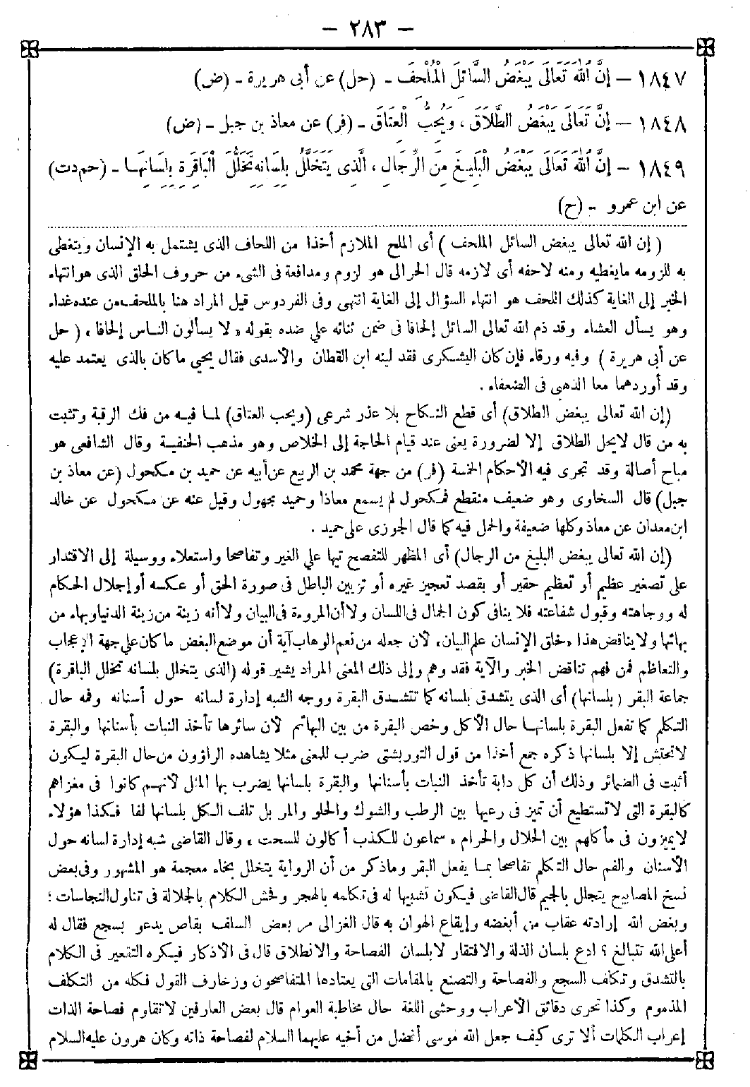 1848 - (إن الله تعالى يبغض الطلاق) أي قطع النكاح بلا عذر شرعي (ويحب العتاق) لما فيه من فك الرقبة وتثبت به من قال لا يحل الطلاق إلا لضرورة يعني عند قيام الحاجة إلى الخلاص وهو مذهب الحنفية وقال الشافعي هو مباح أصالة وقد تجري فيه الأحكام الخمسة