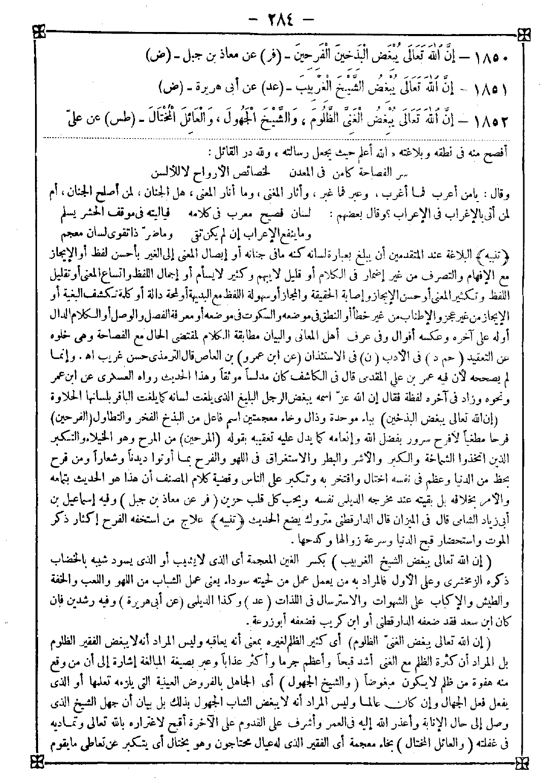 1852 - (إن الله تعالى يبغض الغني الظلوم) أي كثير الظلم لغيره بمعنى أنه يعاقبه وليس المراد أنه لا يبغض الفقير الظلوم بل المراد أن كثرة الظلم مع الغنى أشد قبحا وأعظم جرما وأكثر عذابا وعبر بصيغة المبالغة إشارة إلى أن من وقع منه هفوة من ظلم لا يكون مبغوضا (والشيخ الجهول) أي الجاهل بالفروض العينية التي يلزمه تعلمها أو الذي يفعل فعل الجهال وإن كان عالما وليس المراد أنه لا يبغض الشاب الجهول بذلك بل بيان أن جهل الشيخ الذي وصل إلى حال الإنابة وأعذر الله إليه في العمر وأشرف على القدوم على الآخرة أقبح لاغتراره بالله تعالى وتماديه في غفلته (والعائل المختال) بخاء معجمة أي الفقير الذي له عيال محتاجون وهو يختال أي يتكبر عن تعاطي ما يقوم -[285]- بأودهم ويهمل أمرهم ويضيعهم وكفى بالمرء إثما أن يضيع من يعول ولم يعبر فيه بصيغة المبالغة لعظم جرم التكبر وشر عاقبته لما فيه من منازعة الله في دائه فالقليل منه ليس في محل العفو كما في ذينك