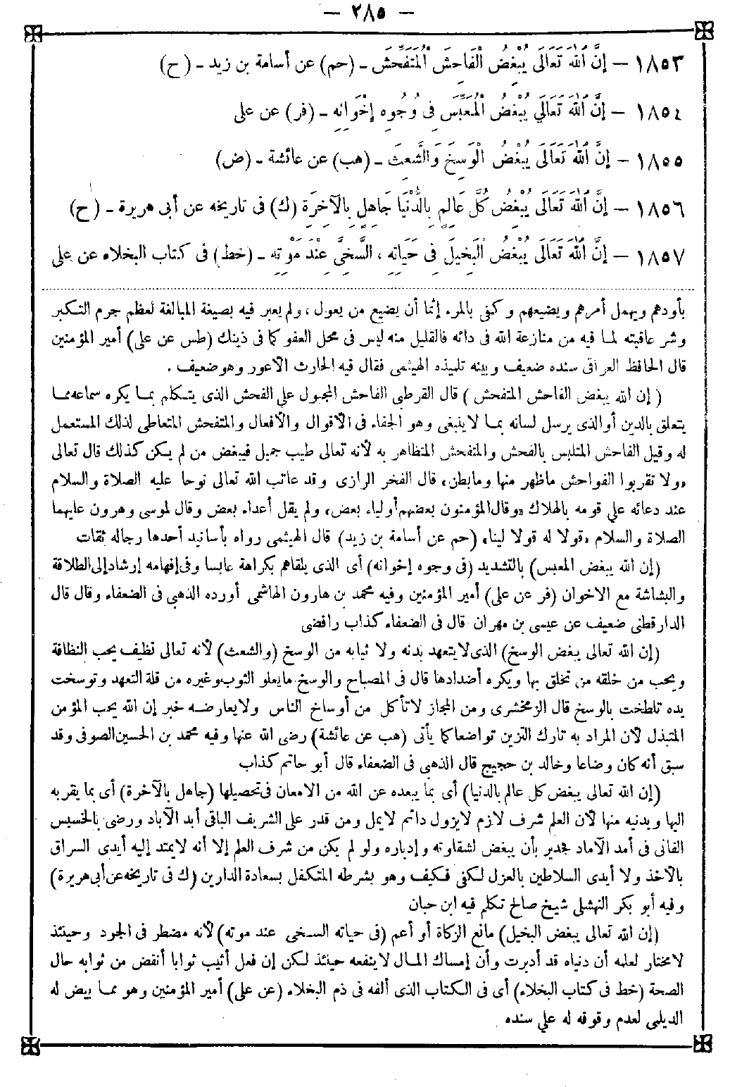 1853 - (إن الله يبغض الفاحش المتفحش) قال القرطبي: الفاحش المجبول على الفحش الذي يتكلم بما يكره سماعه مما يتعلق بالدين أو الذي يرسل لسانه بما لا ينبغي وهو الجفاء في الأقوال والأفعال والمفتحش المتعاطي لذلك المستعمل له وقيل الفاحش المتبلس بالفحش والمتفحش المتظاهر به لأنه تعالى طيب جميل فيبغض من لم يكن كذلك قال تعالى { {ولا تقربوا الفواحش ما ظهر منها وما بطن} قال الفخر الرازي: وقد عاتب الله تعالى نوحا عليه الصلاة والسلام عند دعائه على قومه بالهلاك. وقال {المؤمنون بعضهم أولياء بعض} ولم يقل أعداء بعض وقال موسى وهارون عليهما الصلاة السلام {فقولا له قولا لينا}