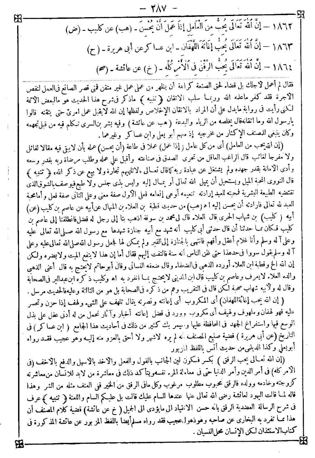 1862 - (إن الله يحب من العامل) أي من كل عامل (إذا عمل) عملا في طاعة (أن يحسن) عمله بأن لا يبقى فيه مقالا لقائل ولا مفرجا لغائب. قال الراغب: العاقل من تحرى الصدق في صناعته وأقبل على عمله وطلب مرضاة ربه بقدر وسعه وأدى الأمانة بقدر جهده ولم يشتغل عن عبادة ربه كما قال تعالى {لا تلهيهم تجارة ولا بيع عن ذكر الله} <تنبيه> قال النووي: المحبة الميل ويستحيل أن يميل الله تعالى أو يمال إليه وليس بذي جنس ولا طبع فيوصف بالشوق الذي تقتضيه الطبيعة البشرية فمحبته للعبد إرادته تنعيمه أو هي إنعامه فعلى الأول صفة وعلى الثاني صفة فعل وأما محبة العبد لله تعالى فإرادته أن يحسن إليه اه