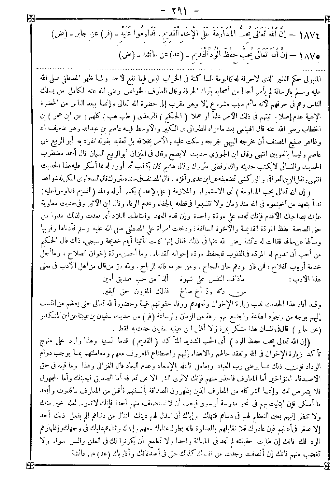 1875 - (إن الله تعالى يحب حفظ الود) أي الحب الشديد المتأكد (القديم) قدما نسبيا وهذا وارد على منهج تأكد زيارة الإخوان في الله وتفقد حالهم والإهداء إليهم واصطناع المعروف معهم ومعاملتهم بما يوجب دوام الوداد فإن ذلك مما يرضي رب العباد ويعامل فاعله بالإسعاد وعدم البعاد. قال الغزالي: وهذا وما قبله في حق الأصدقاء المتؤاخين أما المعارف فاحذر منهم فإنك لا ترى الشر إلا ممن تعرفه أما الصديق فيعينك وأما المجهول فلا يتعرض لك وإنما الشر كله من المعارف الذين يظهرون الصداقة بألسنتهم فأقلل من المعارف ما قدرت وأبعد ما أمكن فإن ابتليت بهم في نحو مدرسة أو سوق فيجب ألا تستضعف منهم أحدا فإنك لا تدري لعله خير منك ولا تنظر إليهم بعين التعظيم لهم في دنياهم فتهلك وإياك أن تبذل لهم دينك لتنال من دنياهم فلم يفعل ذلك أحد إلا صغر في أعينهم فإن عادوك فلا تقابلهم بالعداوة فإنه يطول عناءك معهم وإياك وثناءهم عليك في وجهك وإظهارهم الود لك فإنك إن طلبت حقيقته لم تجد في المئة واحدا ولا تطمع أن يكونوا لك في العلن والسر سواء ولا تغضب منهم فإنك إن أنصفت وجدت من نفسك كذلك حتى في أصدقائك وأقاربك