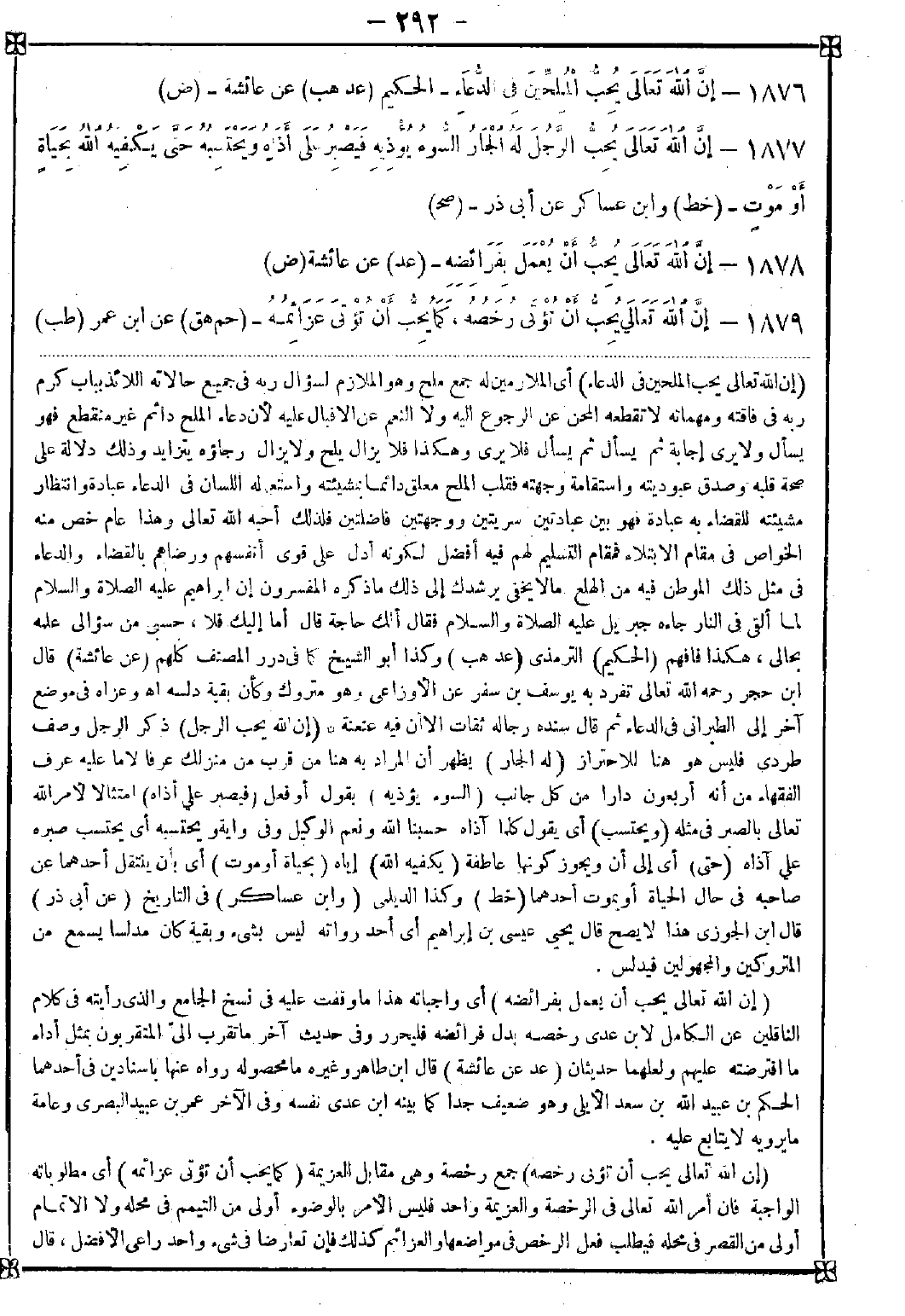 -[292]- 1876 - (إن الله تعالى يحب الملحين في الدعاء) أي الملازمين له جمع ملح وهو الملازم لسؤال ربه في جميع حالاته اللائذ بباب كرم ربه في فاقته ومهماته لا تقطعه المحن عن الرجوع إليه ولا النعم عن الإقبال عليه لأن دعاء الملح دائم غير منقطع فهو يسأل ولا يرى إجابة ثم يسأل ثم يسأل فلا يرى وهكذا فلا يزال يلح ولا يزال رجاؤه يتزايد وذلك دلالة على صحة قلبه وصدق عبوديته واستقامة وجهته فقلب الملح معلق دائما بمشيئته واستعماله اللسان في الدعاء عبادة وانتظار مشيئته للقضاء به عبادة فهو بين عبادتين سريتين ووجهتين فاضلتين فلذلك أحبه الله تعالى وهذا عام خص منه الخواص في مقام الابتلاء فمقام التسليم لهم فيه أفضل لكونه أدل على قوى أنفسهم ورضاهم بالقضاء والدعاء في مثل ذلك الموطن فيه من الهلع ما لا يخفى يرشدك إلى ذلك ما ذكره المفسرون إن إبراهيم عليه الصلاة والسلام لما ألقي في النار جاءه جبريل عليه الصلاة والسلام فقال ألك حاجة قال أما إليك فلا حسبي من سؤالي علمه بحالي هكذا فافهم