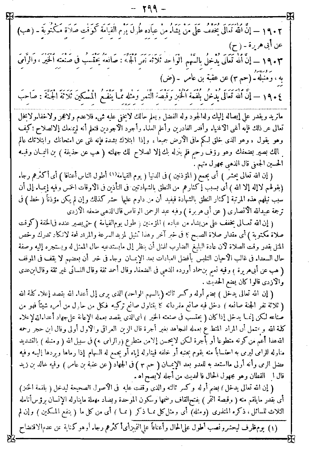 1901 - (إن الله تعالى يحشر) أي يجمع (المؤذنين) في الدنيا (يوم القيامة (1) أطول الناس أعناقا) أي أكثرهم رجاء (بقولهم لا إله إلا الله) أي بسبب إكثارهم من النطق بالشهادتين في التأذين في الأوقات الخمس وفيه إيماء إلى أن سبب نيلهم هذه المرتبة إكثار النطق بالشهادة فيفيد أن من دوام عليها حشر كذلك وإن لم يكن مؤذنا