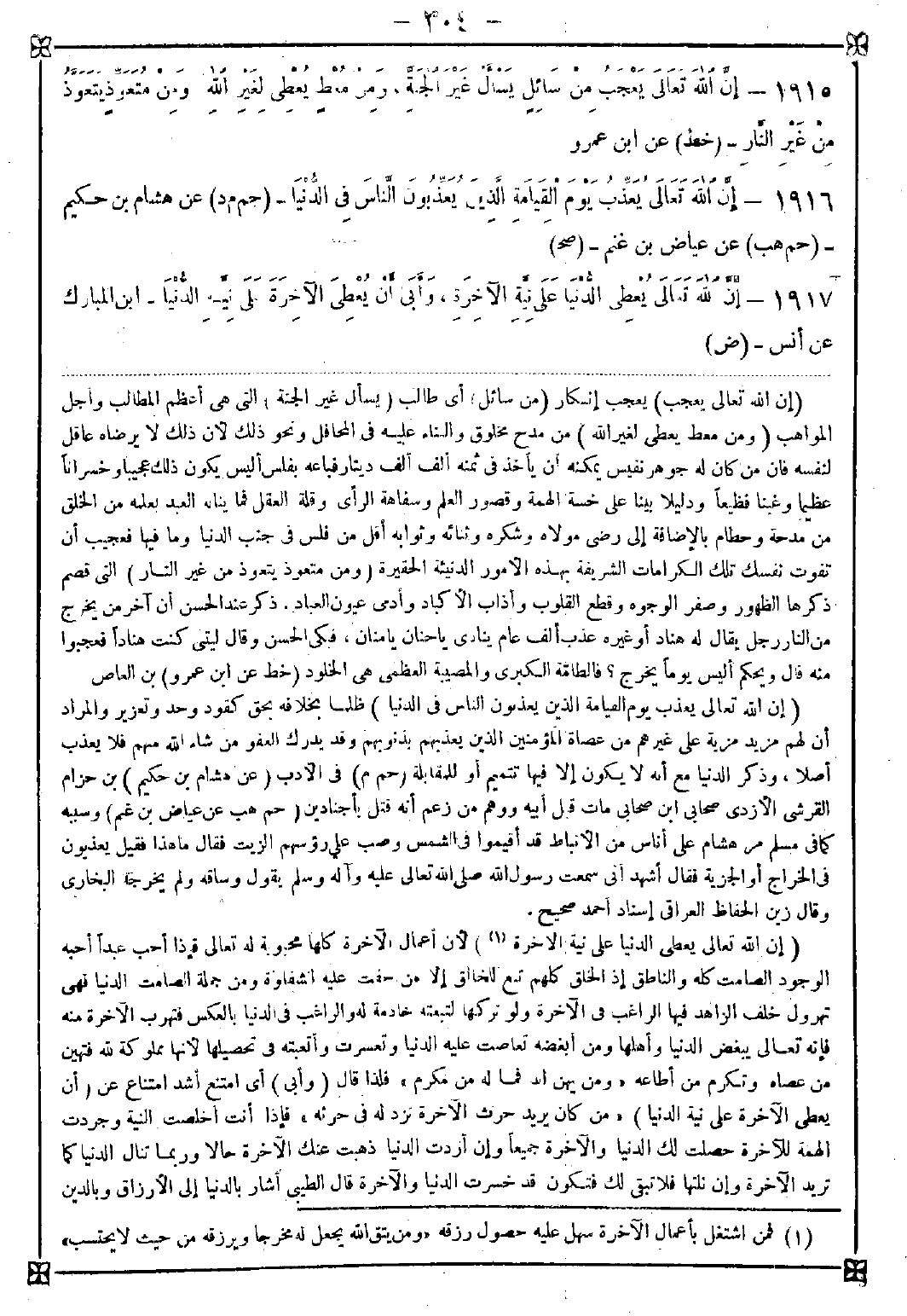 -[304]- 1915 - (إن الله تعالى يعجب) يعجب إنكار (من سائل) أي طالب (يسأل غير الجنة) التي هي أعظم المطالب وأجل المواهب (ومن معط يعطي لغير الله) من مدح مخلوق والبناء عليه في المحافل ونحو ذلك لأن ذلك لا يرضاه عاقل لنفسه فإن من كان له جوهر نفيس يمكنه أن يأخذ في ثمنه ألف ألف دينار فباعه بفلس أليس يكون ذلك عجيبا وخسرانا عظيما وغبنا فظيعا ودليلا بينا على خسة الهمة وقصور العلم وسفاهة الرأي وقلة العقل فما يناله العبد يعلمه من الخلق من مدحة وحطام بالإضافة إلى رضى مولاه وشكره وثنائه وثوابه أقل من فلس في جنب الدنيا وما فيها فعجيب أن تفوت نفسك تلك الكرامات الشريفة بهذه الأمور الدنيئة الحقيرة (ومن متعوذ يتعوذ من غير النار) التي قصم ذكرها الظهور وصفر الوجوه وقطع القلوب وأذاب الأكباد وأدمى عيون العباد. ذكر عند الحسن أن آخر من يخرج من النار رجل يقال له هناد أو غيره عذب ألف عام ينادي يا حنان يا منان فبكى الحسن وقال ليتني كنت هنادا فعجبوا منه قال ويحكم أليس يوما يخرج؟ فالطامة الكبرى والمصيبة العظمى هي الخلود