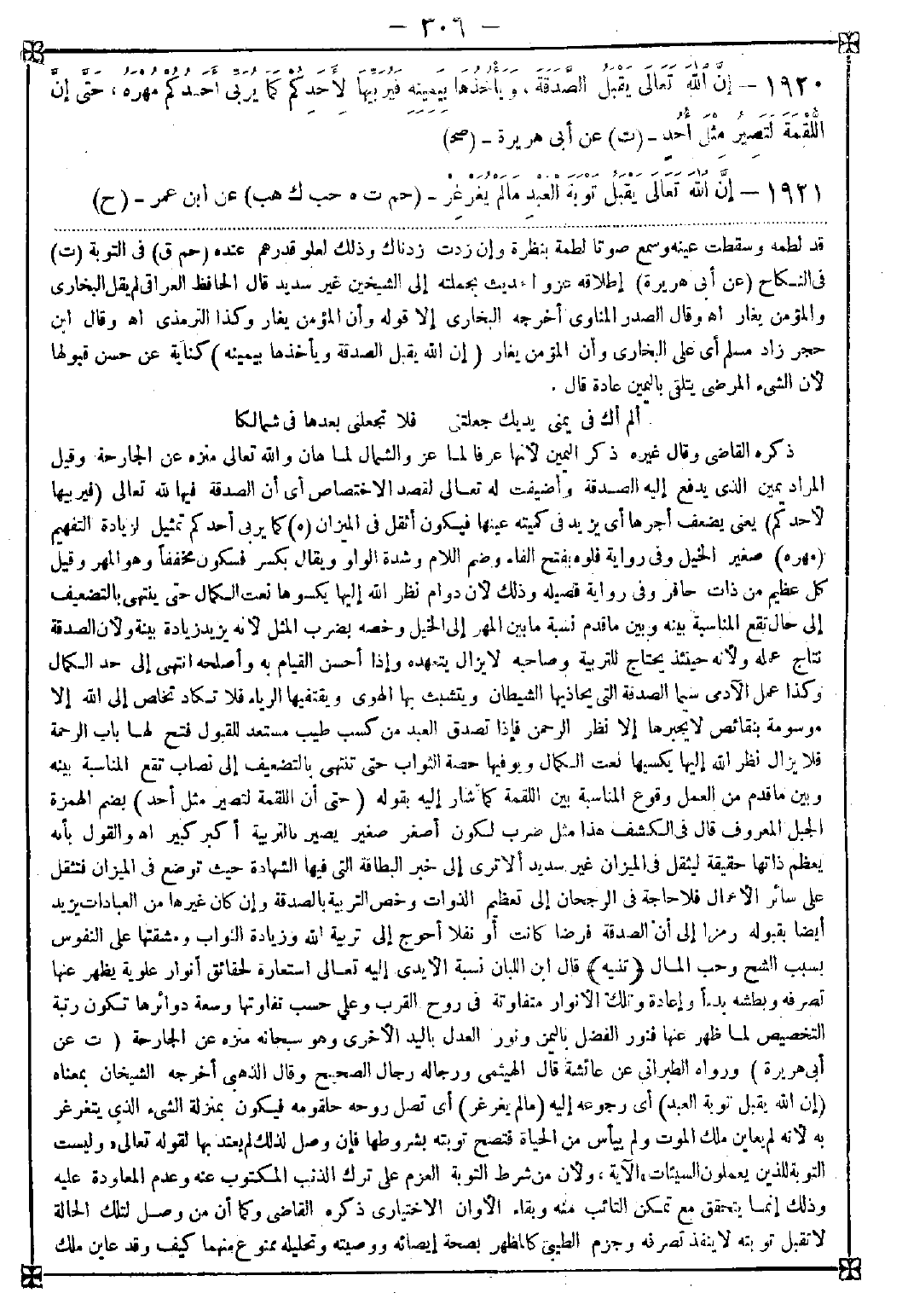 1920 - (إن الله يقبل الصدقة ويأخذها بيمينه) كناية عن حسن قبولها لأن الشيء المرضي يتلقى باليمين عادة قال:
