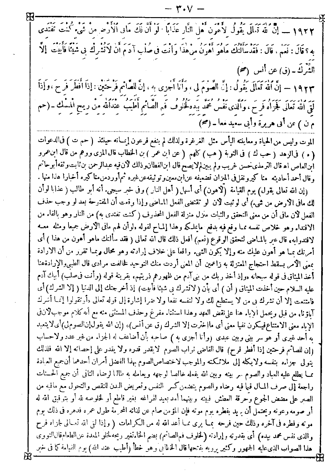 1922 - (إن الله تعالى يقول) يوم القيامة (لأهون) أي أسهل (أهل النار) وفي خبر سيجيء أنه أبو طالب (عذابا لو أن لك ما في الأرض من شيء) أي لو ثبت لأن لو تقتضي الفعل الماضي وإذا وقعت أن المفتوحة بعد لو وجب حذف الفعل لأن ما في أن من معنى التحقق والثبات منزل منزلة الفعل المحذوف (كنت تفتدي به) من النار وهو بالفاء من الافتداء وهو خلاص نفسه مما وقع فيه بدفع ما يملكه وهذا إلماح لقوله {لو أن لهم ما في الأرض جميعا ومثله معه لافتدوا به} قال: عبر بالماضي لتحقق الوقوع (نعم) أفعل ذلك قال الله تعالى (فقد سألتك ما هو أهون من هذا) أي أمرتك بما هو أهون عليك منه وإلا يكون الشيء واقعا على خلاف إرادته وهو محال وبما تقرر من أن الإرادة بمعنى الأمر يسقط احتجاج المعتزلة به زاعمين أن المعنى أردت منك التوحيد فخالفت مرادي قال الطيبي: والإرادة هنا أخذ الميثاق في قوله سبحانه {وإذ أخذ ربك من بني آدم من ظهورهم ذريتهم} بقرينة قوله (وأنت في صلب) أبيك (آدم) عليه السلام حين أخذت الميثاق (أن) أي بأن (لا تشرك بي شيئا فأبيت) إذ أخرجتك إلى الدنيا (إلا الشرك) أي فامتنعت إلا أن تشرك بي من لا يستطيع لك ولا لنفسه نفعا ولا ضرا إشارة إلى قوله تعالى {أو تقولوا إنما أشرك آباؤنا من قبل} ويحمل الآباء هنا على نقض العهد وهذا استثناء مفرغ وحذف المستثنى منه مع أنه كلام موجب لأن في الإباء معنى الامتناع فيكون نفيا معنى أي ما اخترت إلا الشرك