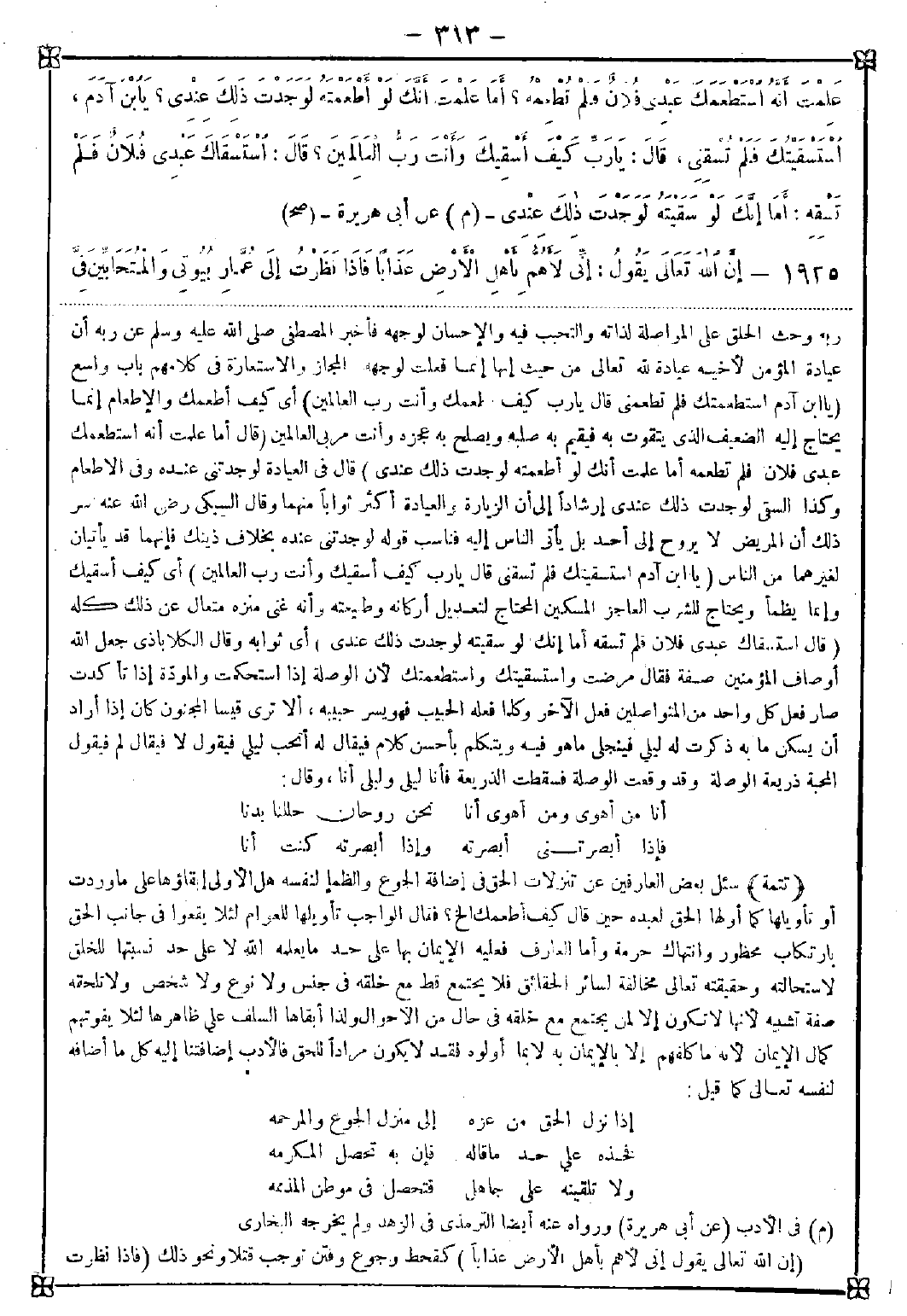1935 - (إن الله تعالى يقول إني لأهم بأهل الأرض عذابا) كقحط وجوع وفتن توجب قتلا ونحو ذلك (فإذا نظرت -[314]- إلى عمار بيوتي) أي عمار المساجد التي هي بيوت الله بالذكر والتلاوة والصلاة وأنواع العبادة (والمتحابين في) أي لأجلي لا لغرض دنيوي (والمستغفرين بالأسحار) أي الطالبين من الله المغفرة فيها (صرفت عذابي عنهم) أي عن أهل الأرض إكراما لهؤلاء ويحتمل عود الضمير إلى هؤلاء فقط لكن يؤيد الأول خبر لولا شيوخ ركع وأطفال رضع وبهائم رتع لصب عليكم العذاب صبا وليس المراد بالهم هنا حقيقته من العزم على الشيء ولا الإرادة والألم يتخلف وقوعه بل ذكر تقريبا لأفهامنا وحبا لنا على هذه الخصال الفاضلة وخصها لما في الأولى من إقامة شعائر الدين وفي الثانية من الائتلاف والاجتماع على نصره وفي الثالثة من محو الذنوب أو فأولا ولأن الاستغفار ممحاة للذنوب كما في خبر يأتي فلذلك كانت صارفة للعذاب