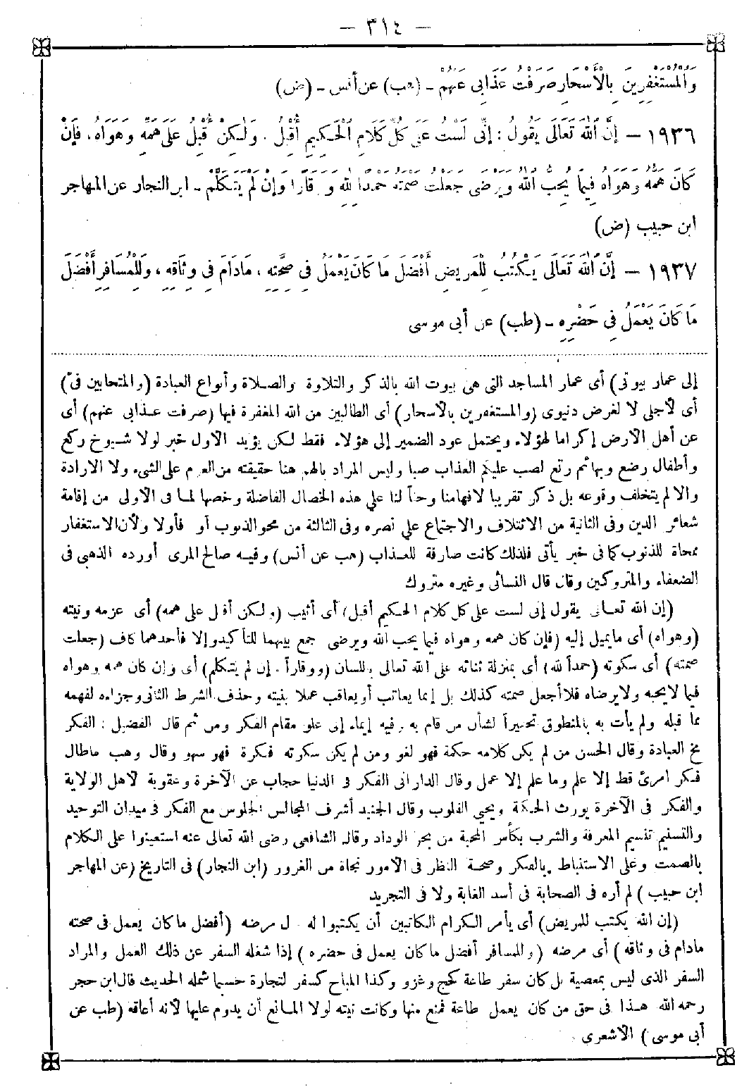 1937 - (إن الله يكتب للمريض) أي يأمر الكرام الكاتبين أن يكتبوا له حال مرضه (أفضل ما كان يعمل في صحته ما دام في وثاقه) أي مرضه (والمسافر أفضل ما كان يعمل في حضره) إذا شغله السفر عن ذلك العمل والمراد السفر الذي ليس بمعصية بل كان سفر طاعة كحج وغزو وكذا المباح كسفر لتجارة حسبما شمله الحديث قال ابن حجر رحمه الله: هذا في حق من كان يعمل طاعة فمنع منها وكانت نيته لولا المانع أن يدوم عليها لأنه أعاقه