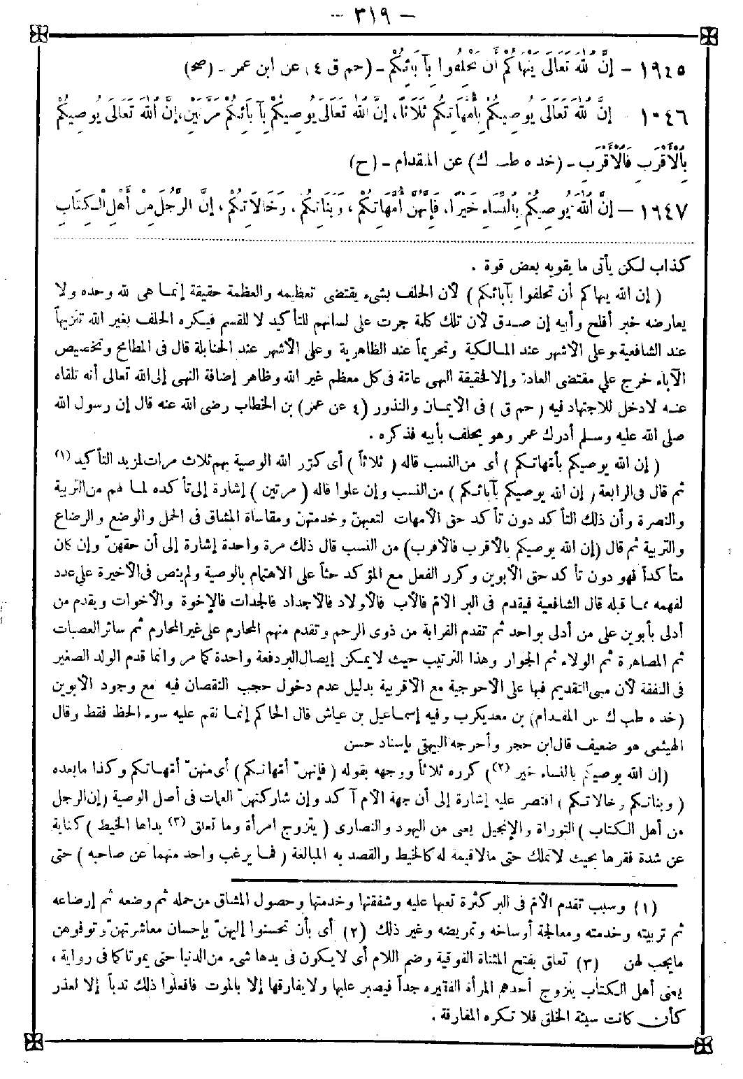 1946 - (إن الله يوصيكم بأمهاتكم) أي من النسب قاله (ثلاثا) أي كرر الله الوصية بهم ثلاث مرات لمزيد التأكيد (1) ثم قال في الرابعة (إن الله يوصيكم بآبائكم) من النسب وإن علو قاله (مرتين) إشارة إلى تأكده لما لهم من التربية والنصرة وأن ذلك التأكد دون تأكد حق الأمهات لتعبهن وخدمتهن ومقاساة المشاق في الحمل والوضع والرضاع والتربية ثم قال (إن الله يوصيكم بالأقرب فالأقرب) من النسب قال ذلك مرة واحدة إشارة إلى أن حقهن وإن كان متأكدا فهو دون تأكد حق الأبوين وكرر الفعل مع المؤكد حثا على الاهتمام بالوصية ولم ينص في الأخيرة على عدد لفهمه مما قبله قال الشافعية فيقدم في البر الأم فالأب فالأولاد فالأجداد فالجدات فالإخوة والأخوات ويقدم من أدلى بأبوين على من أدلى بواحد ثم تقدم القرابة من ذوي الرحم وتقدم منهم المحارم على غير المحارم ثم سائر العصبات ثم المصاهرة ثم الولاء ثم الجوار وهذا الترتيب حيث لا يمكن إيصال البر دفعة واحدة كما مر وإنما قدم الولد الصغير في النفقة لأن مبنى التقديم فيها على الأحوجية مع الأقربية بدليل عدم دخول حجب النقصان فيه مع وجود الأبوين
