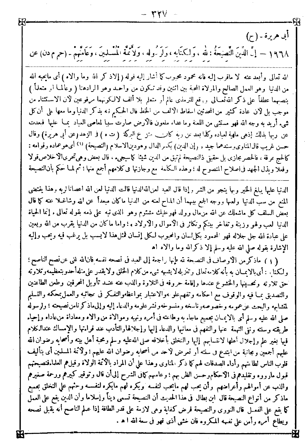 1968 - (إن الدين) بكسر الدال وهو دين الإسلام (النصيحة) (1) أي هو عماده وقوامه: كالحج عرفة فالحصر مجازي بل حقيقي فالنصيحة لم تبق من الدين شيئا كما سيجيء قال بعض وهي تحري الإخلاص قولا وفعلا وبذل الجهد في إصلاح المنصوح له وهذه الكلمة مع وجازتها في كلامهم أجمع منها ثم لما حكم بأن النصيحة -[328]- هي الدين قال مفسرا مبينا (لله) بالإيمان به ونفي الشريك ووصفه بجميع صفات الكمال والجلال وتنزيهه عن جميع ما لا كمال فيه وتجنب معصيته والحب والبغض فيه والاعتراف بنعمته وشكره عليها والشفقة على خلقه والدعاء إلى ذلك فمن النصيحة لله أن لا تدخل في صفاته ما ليس منها ولا تنسب إليه ما ليس له برأيك فتعتقده على خلاف ما هو عليه فإنه غش والأشياء كلها بخلاف الباري تعالى لأنها محدثة وهو قديم وجاهلة وهو عليم وعاجزة وهو قدير وعبيده وهو رب وفقيرة وهو غني ومحتاجة إلى مكان وهو غير محتاج إليه فمن شبهه بشيء من خلقه فقد أدخل الغش في صفاته ولم ينصح له ومن أضاف شيئا إلى المخلوقات مما هو عليه فقد غشها (ولكتابه) مفرد مضاف فيعم سائر كتبه وذلك يبذل جهده في الذب عنه من تأويل الجاهلين وانتحال المطالبين بالوقوف عند أحكامه. (ولرسوله) بالإيمان بما جاء به ونصرته حيا وميتا وإعظام حقه وبث دعوته ونشر سنته والتلطف في تعلمها وتعليمها والتأدب بآدابه وتجنب من تعرض لأحد من آله وأصحابه (ولأئمة المسلمين) الخلفاء ونوابهم بمعاونتهم على الحق وإطاعتهم فيه وأمرهم به وتذكيرهم برفق وإعلامهم بما غفلوا عنه من حق المسلمين وترك الخروج عليهم والدعاء بصلاحهم (وعامتهم) بإرشادهم لما يصلح أخراهم ودنياهم وكف الأذى عنهم وتعليمهم ما جهلوه وستر عورتهم وسد خلتهم وأمرهم بالمعروف ونهيهم عن المنكر برفق وشفقة ونحو ذلك فبدأ أولا بالله لأن الدين له حقيقة وثنى بكتابه الصادع ببيان أحكامه المعجز ببديع نظامه وثلث بما يتلو كلامه في الرتبة وهو رسوله الهادي لدينه الموقف على أحكامه المفصل لجمل شريعته وربع بأولي الأمر الذين هم خلفاء الأنبياء القائمون بسنتهم ثم خمس بالتعميم <تنبيه> قال ابن عربي: إذا عرف من شخص المخالفة واللجاج وأنه إذا دله على أمر فيه نصيحته عمل بخلافه فالنصح عدم النصح بل يشير عليه بخلاف ذلك فيخالفه فيفعل ما ينبغي قال وهذه نصيحة لا يشعر بها كل أحد وهي تسمى علم السياسة فإنه يسوس به النفوس الجموحة الشاردة عن طريق مصالحها قال فمن قلنا إن الناصح في دين الله يحتاج إلى علم وعقل وفكر صحيح وروية حسنة واعتدال مزاج وتؤدة فإن لم يكن فيه هذه الخصال فالخطأ أسرع إليه من الإصابة وما في مكارم الأخلاق أدق ولا أخفى ولا أعظم من النصيحة (2)