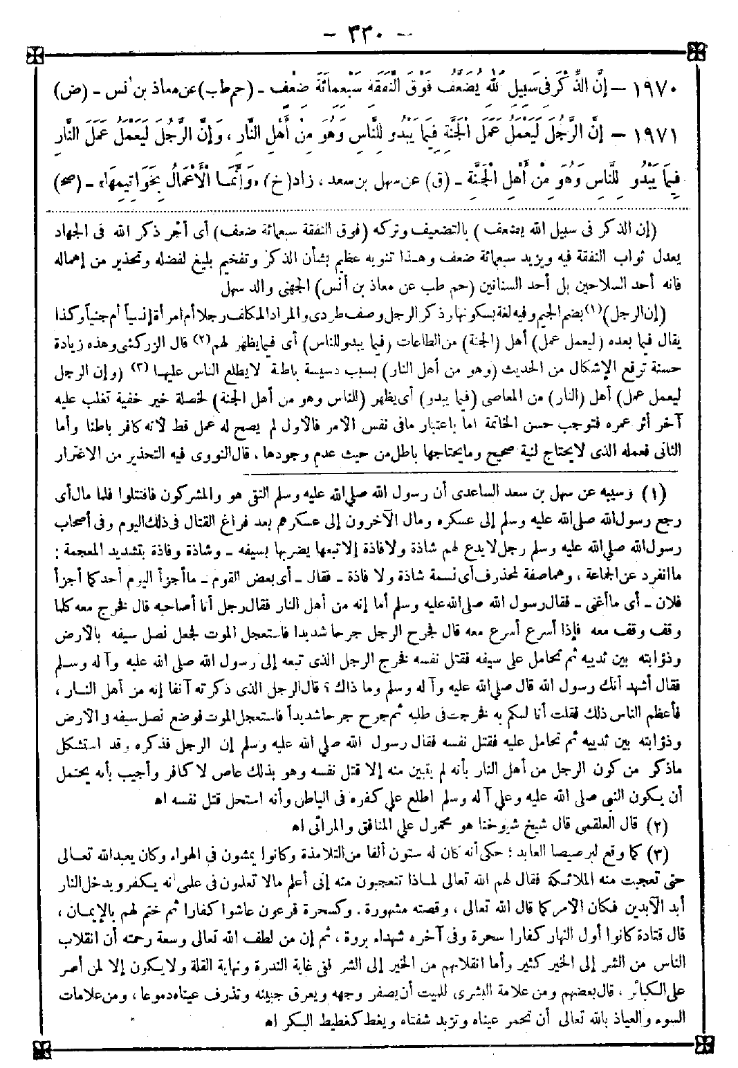 (1) وسببه عن سهل بن سعد الساعدي أن رسول الله صلى الله عليه وسلم التقى هو والمشركون فاقتتلوا فلما مال أي رجع رسول الله صلى الله عليه وسلم إلى عسكره ومال الآخرون إلى عسكرهم وبعد فراغ القتال في ذلك اليوم وفي أصحاب رسول الله صلى الله عليه وسلم رجل لا يدع لهم شاذة ولا فاذة إلا تبعها يضربها بسيفه وشاذة وفاذة بتشديد المعجمة: ما انفرد عن الجماعة وهما صفة لمحذوف أي نسمة شاذة ولا فاذة - فقال - أي بعض القوم - ما أجزأ اليوم أحد كما أجزأ فلان - أي ما أغنى - فقال رسول الله صلى الله عليه وسلم أما إنه من أهل النار فقال رجل أنا أصاحبه قال فخرج معه كلما وقف وقف معه فإذا أسرع أسرع معه قال فجرح الرجل جرحا شديدا فاستعجل الموت فجعل نصل سيفه بالأرض وذؤابته بين ثدييه ثم تحامل على سيفه فقتل نفسه فخرج الرجل الذي تبعه إلى رسول الله صلى الله عليه وآله وسلم فقال أشهد أنك رسول الله قال صلى الله عليه وآله وسلم وما ذاك؟ قال الرجل الذي ذكرته آنفا إنه من أهل النار فأعظم الناس ذلك فقلت أنا لكم به فخرجت في طلبه ثم جرح جرحا شديدا فاستعجل الموت فوضع نصل سيفه في الأرض وذؤابته بين ثدييه ثم تحامل عليه فقتل نفسه فقال رسول الله صلى الله عليه وسلم إن الرجل فذكره وقد استشكل ما ذكر من كون الرجل من أهل النار بأنه لم يتبين منه إلا قتل نفسه وهو بذلك عاص لا كافر وأجيب بأنه يحتمل أن يكون النبي صلى الله عليه وعلى آله وسلم اطلع على كفره في الباطن وأنه استحل قتل نفسه اه