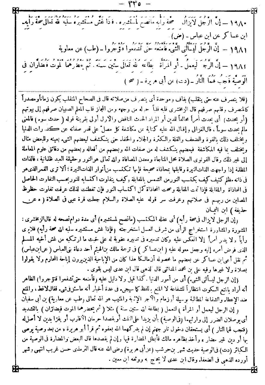 1982 - (إن الرجل ليعمل أو المرأة) لتعمل (بطاعة الله ستين سنة) مثلا (ثم يحضرهما الموت فيضاران) بالتشديد أي يوصلان الضرر إلى وارثيهما (في الوصية) بأن يزيدا على الثلث أو يقصدا حرمان الأقارب أو يقرا بدين لا أصل له (فتجب لهما النار) أيستحقان دخول نار جهنم إن لم يدركهما الله بعفوه ثم قرأ أبو هريرة {من بعد وصية يوصى بها أو دين غير مضار} وأخذ بظاهره مالك فأبطل المضارة فيها وإن لم يقصدها قال البعض والمضارة في الوصية من الكبائر