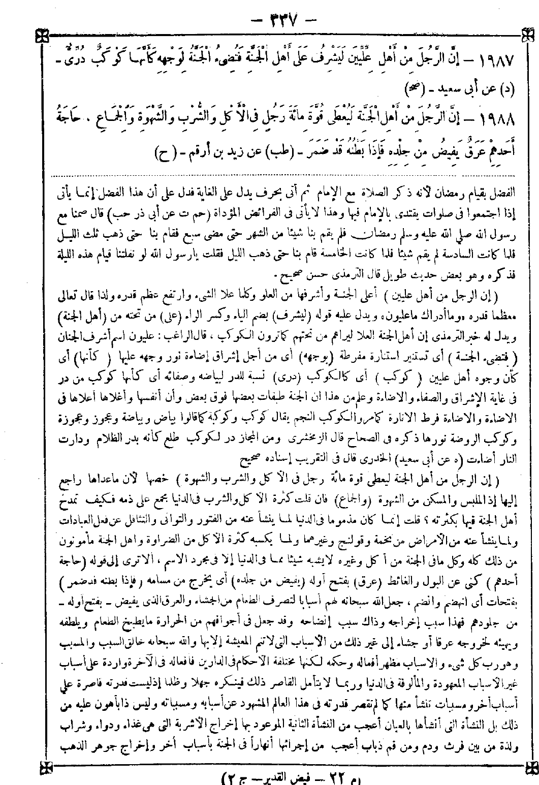 1987 - (إن الرجل من أهل عليين) أعلى الجنة وأشرفها من العلو وكلما علا الشيء وارتفع عظم قدره ولذا قال تعالى معظما قدره {وما أدراك ما عليون} ويدل عليه قوله (ليشرف) بضم الياء وكسر الراء (على) من تحته من (أهل الجنة) ويدل له خبر الترمذي إن أهل الجنة العلا ليراهم من تحتهم كما ترون الكوكب قال الراغب: عليون اسم أشرف الجنان (فتضيء الجنة) أي يستنير استنارة مفرطة (بوجهه) أي من أجل إشراق إضاءة نور وجهه عليها (كأنها) أي كأن وجوه أهل عليين (كوكب) أي كالكوكب (دري) نسبة للدر لبياضه وصفائه أي كأنها كوكب من رد في غاية الإشراق والصفاء والإضاءة وعلم من هذا أن الجنة طبقات بعضها فوق بعض وأن أنفسها وأغلاها أعلاها في الإضاءة والإضاءة فرط الإنارة كما مر والكوكب النجم يقال كوكب وكوكبة كما قالوا بياض وبياضة وعجوز وعجوزة وكوكب الروضة نورها ذكره في الصحاح. قال الزمخشري: ومن المجاز در لكوكب طلع كأنه بدر الظلام ودارت النار أضاءت