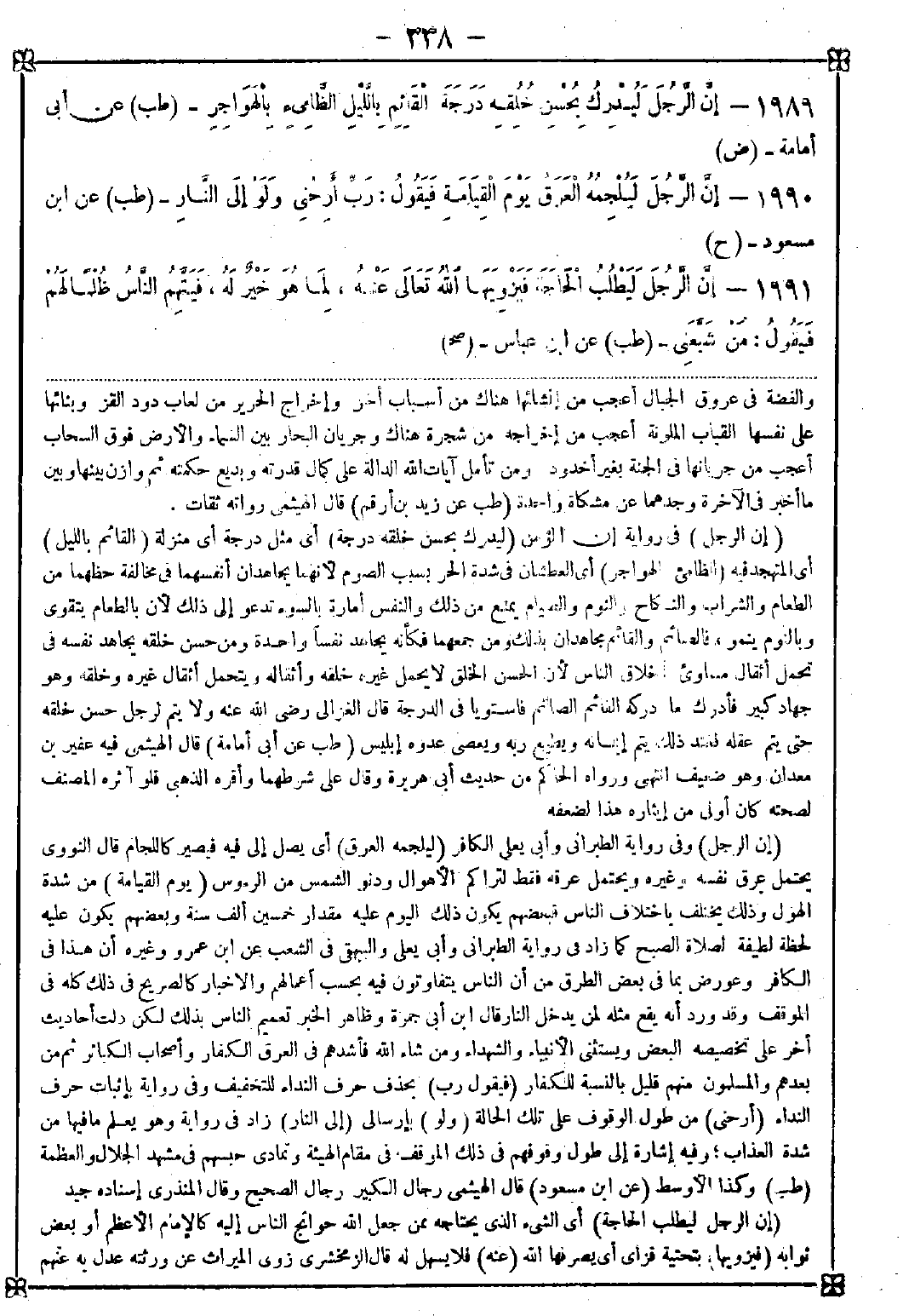 1990 - (إن الرجل) وفي رواية الطبراني وأبي يعلى الكافر (ليلجمه العرق) أي يصل إلى فيه فيصير كاللجام قال النووي: يحتمل عرق نفسه وغيره ويحتمل عرقه فقط لتراكم الأهوال ودنو الشمس من الرؤوس (يوم القيامة) من شدة الهول وذلك يختلف باختلاف الناس فبعضهم يكون ذلك اليوم عليه مقدار خمسين ألف سنة وبعضهم يكون عليه لحظة لطيفة لصلاة الصبح كما زاد في رواية الطبراني وأبي يعلى والبيهقي في الشعب عن ابن عمرو وغيره أن هذا في الكافر وعورض بما في بعض الطرق من أن الناس يتفاوتون فيه بحسب أعمالهم والأخبار كالصريح في ذلك كله في الموقف وقد ورد أنه يقع مثله لمن يدخل النار. قال ابن أبي جمر: وظاهر الخبر تعميم الناس بذلك لكن دلت أحاديث أخر على تخصيصه البعض ويستثنى الأنبياء والشهداء ومن شاء الله فأشدهم في العرق الكفار وأصحاب الكبائر ثم من بعدهم والمسلمون منهم قليل بالنسبة للكفار (فيقول رب) بحذف حرف النداء للتخفيف وفي رواية بإثبات حرف النداء (أرحني) من طول الوقوف على تلك الحالة (ولو) بإرسالي (إلى النار) زاد في رواية وهو يعلم ما فيها من شدة العذاب وفيه إشارة إلى طول وقوفهم في ذلك الموقف في مقام الهيئة وتمادي حبسهم في مشهد الجلال والعظمة
