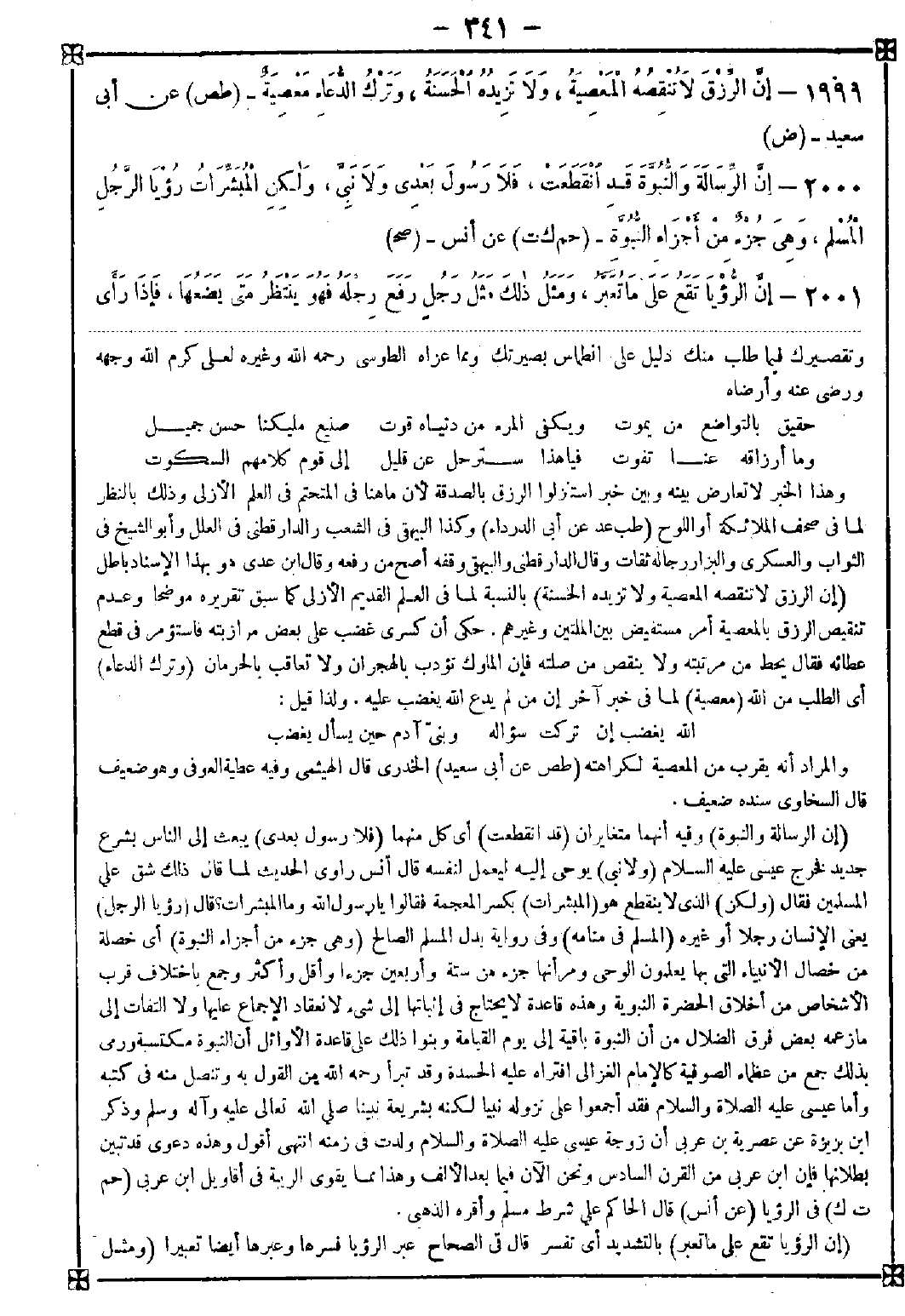 2000 - (إن الرسالة والنبوة) وفيه أنهما متغايران (قد انقطعت) أي كل منهما (فلا رسول بعدي) يبعث إلى الناس بشرع جديد فخرج عيسى عليه السلام (ولا نبي) يوحى إليه ليعمل لنفسه قال أنس راوي الحديث لما قال ذلك شق على المسلمين فقال (ولكن) الذي لا ينقطع هو (المبشرات) بكسر المعجمة فقالوا يا رسول الله وما المبشرات؟ قال (رؤيا الرجل) يعني الإنسان رجلا أو غيره (المسلم في منامه) وفي رواية بدل المسلم الصالح (وهي جزء من أجزاء النبوة) أي خصلة من خصال الأنبياء التي بها يعلمون الوحي ومر أنها جزء من ستة وأربعين جزءا وأقل وأكثر وجمع باختلاف قرب الأشخاص من أخلاق الحضرة النبوية وهذه قاعدة لا يحتاج في إثباتها إلى شيء لانعقاد الإجماع عليها ولا التفات إلى ما زعمه بعض فرق الضلال من أن النبوة باقية إلى يوم القيامة وبنوا ذلك على قاعدة الأوائل أن النبوة مكتسبة ورمى بذلك جمع من عظماء الصوفية كالإمام الغزالي افتراه عليه الحسدة وقد تبرأ رحمه الله من القول به وتنصل منه في كتبه وأما عيسى عليه الصلاة والسلام فقد أجمعوا على نزوله نبيا لكنه بشريعة نبينا صلى الله تعالى عليه وآله وسلم وذكر ابن بزيزة عن عصرية بن عربي أن زوجة عيسى عليه الصلاة والسلام ولدت في زمنه انتهى أقول وهذه دعوى قد تبين بطلانها فإن ابن عربي من القرن السادس ونحن الآن فيما بعد الألف وهذا مما يقوي الريبة في أقاويل ابن عربي