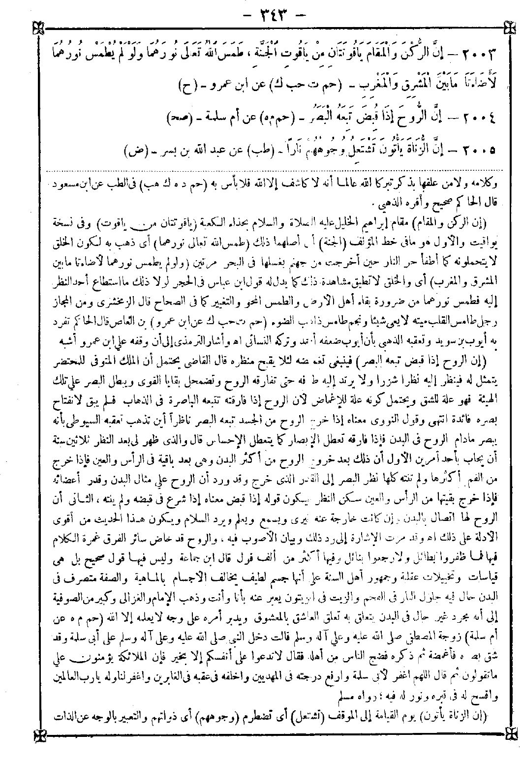 2004 - (إن الروح إذا قبض تبعه البصر) فينبغي تغيمضه لئلا يقبح منظره قال القاضي: يحتمل أن الملك المتوفى للمحتضر يتمثل له فينظر إليه نظرا شزرا ولا يرتد إليه طرفه حتى تفارقه الروح وتضمحل بقايا القوى ويبطل البصر على تلك الهيئة فهو علة للشق ويحتمل كونه للإغماض لأن الروح إذا فارقته تتبعه الباصرة في الذهاب فلم يبق لانفتاح بصره فائدة انتهى. وقول النووي معناه إذا خرج الروح من الجسد تبعه البصر ناظرا أين تذهب تعقبه السيوطي بأنه يبصر ما دام الروح في البدن فإذا فارقه تعطل الإبصار كما يتعطل الإحساس. قال: والذي ظهر لي بعد النظر ثلاثين سنة أن يجاب بأحد أمرين: الأول أن ذلك بعد خروج الروح من أكثر البدن وهي بعد باقية في الرأس والعين فإذا خرج من الفم أكثرها ولم تنته كلها نظر البصر إلى القدر الذي خرج وقد ورد أن الروح على مثال البدن وقدر أعضائه فإذا خرج بقيتها من الرأس والعين سكن النظر فيكون قوله إذا قبض معناه إذا شرع في قبضه ولم ينته الثاني أن الروح لها اتصال بالبدن وإن كانت خارجة عنه يرى ويسمع ويعلم ويرد السلام ويكون هذا الحديث من أقوى الأدلة على ذلك اه وقد مرت الإشارة إلى ذلك وبيان الأصوب فيه والروح قد خاض سائر الفرق غمرة الكلام فيها فما ظفروا بطائل ولا رجعوا بنائل وفيها أكثر من ألف قول قال ابن جماعة: وليس فيها قول صحيح بل هي قياسات وتخييلات عقلية وجمهور أهل السنة على أنها جسم لطيف يخالف الأجسام بالماهية والصفة متصرف في البدن حال فيه حلول النار في الفحم والزيت في الزيتون يعبر عنه بأنا وأنت وذهب الإمام والغزالي وكبير من الصوفية إلى أنه مجرد غير حال في البدن يتعلق به تعلق العاشق بالمعشوق ويدبر أمره على وجه لا يعلمه إلا الله
