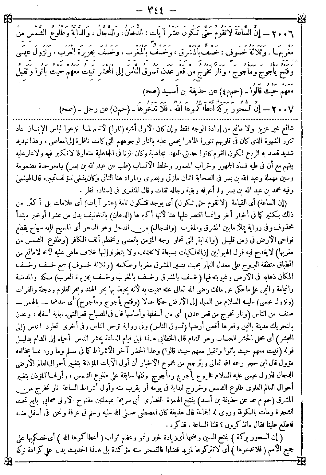 2006 - (إن الساعة) أي القيامة (لا تقوم حتى تكون) أي يوجد فتكون تامة (عشر آيات) أي علامات بل أكثر من ذلك بكثير كما في أخبار آخر وإنما اقتصر عليها هنا لأنها أكبرها (الدخان) بالتخفيف بدل من عشرا أو خبر مبتدأ محذوف وفي رواية يملأ ما بين المشرق والمغرب (والدجال) من الدجل وهو السحر أي المسيح فإنه سياح يقطع نواحي الأرض في زمن قليل (والدابة) التي تجلو وجه المؤمن بالعصي وتخطم أنف الكافر (وطلوع الشمس من مغربها) لا يقدح فيه قول الهيوليين إن الفلكيات بسيطة لا تختلف ولا يتطرق إليها خلاف ما هي عليه لأنه لا مانع من انطباق منطقة البروج على معدل النهار بحيث يصير المشرق مغربا وعكسه (وثلاثة خسوف) جمع خسف وخسف المكان ذهابه في الأرض وغيوبته فيها (خسف بالمشرق وخسف بالمغرب وخسف بجزيرة العرب) مكة والمدينة واليمامة واليمن على ما حكي عن مالك رضي الله تعالى عنه سميت به لأنه يحيط بها بحر الهند وبحر القلزم ودجلة والفرات (ونزول عيسى) عليه السلام من السماء إلى الأرض حكما عدلا (وفتح يأجوج ومأجوج) أي سدهما - بالهمز - صنف من الناس (ونار تخرج من قعر عدن) أي من أسفلها وأساسها قال في المصباح: قعر الشيء نهاية أسفله وعدن بالتحريك مدينة باليمن وقعرها أقصى أرضها (تسوق الناس) وفي رواية ترحل الناس وفي أخرى تطرد الناس (إلى المحشر) أي محل الحشر للحساب وهو الشام قال الخطابي: هذا قبل قيام الساعة يحشر الناس أحياء إلى الشام بدليل قوله (تبيت معهم حيث باتوا وتقيل معهم حيث قالوا) وهذا الحشر آخر الأشراط كما في مسلم وما ورد مما يخالفه مؤول. قال ابن حجر رحمه الله تعالى: ويترجح من مجموع الأخبار أن أول الآيات المؤذنة بتغيير أحوال العالم الأرضي الدجال فنزول عيسى عليه السلام فخروج يأجوج ومأجوج وكلها سابقة على طلوع الشمس وأولها المؤذن بغير أحوال العالم العلوي طلوع الشمس وخروج الدابة في يومه أو يقرب منه وأول أشراط الساعة نار تخرج من المشرق