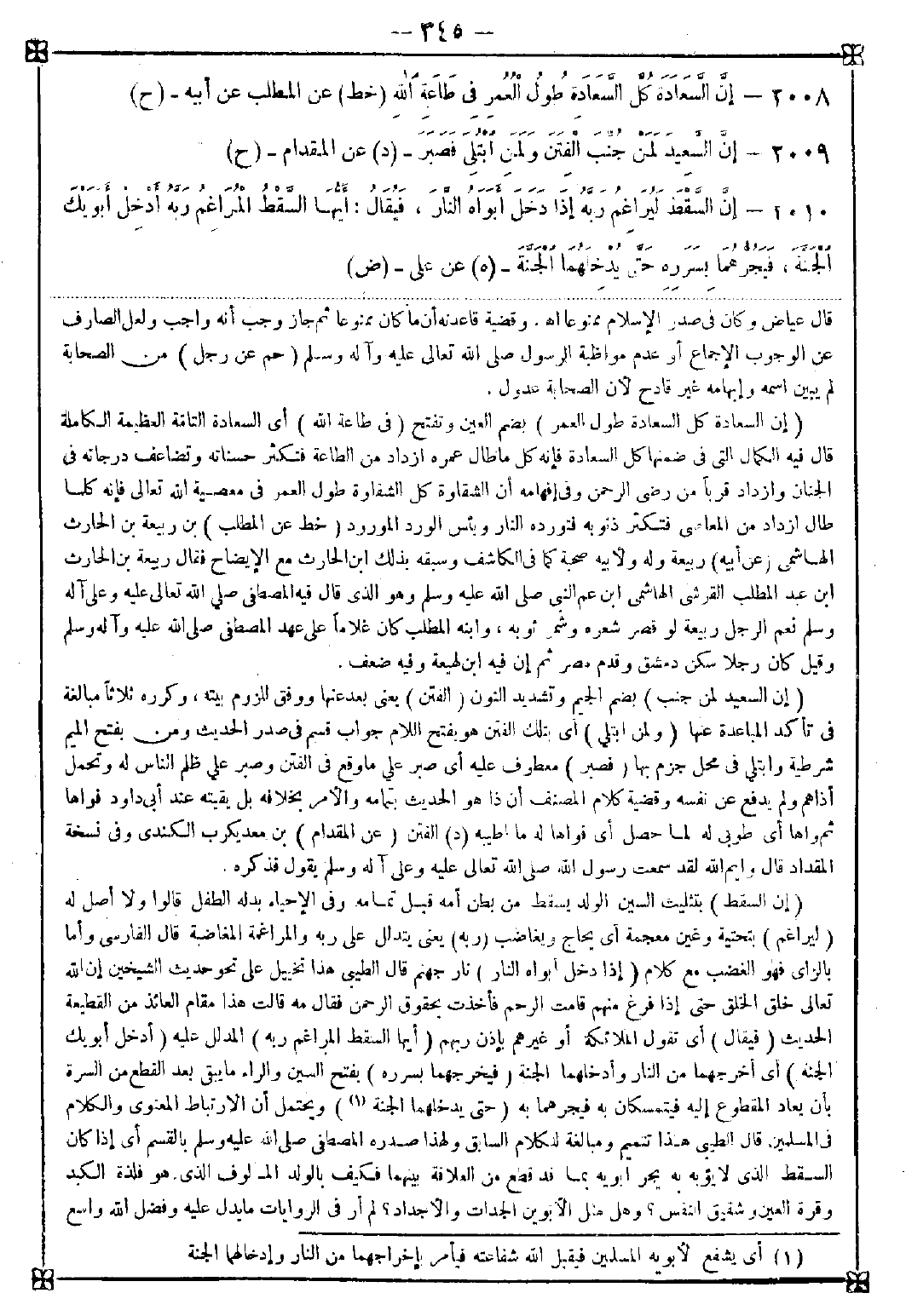 2008 - (إن السعادة كل السعادة طول العمر) بضم العين وتفتح (في طاعة الله) أي السعادة التامة العظيمة الكاملة قال فيه الكمال التي في ضمنها كل السعادة فإنه كل ما طال عمره ازداد من الطاعة فتكثر حسناته وتضاعف درجاته في الجنان وازداد قربا من رضى الرحمن وفي إفهامه أن الشقاوة كل الشقاوة طول العمر في معصية الله تعالى فإنه كلما طال ازداد من المعاصي فتكثر ذنوبه فتورده النار وبئس الورد المورود