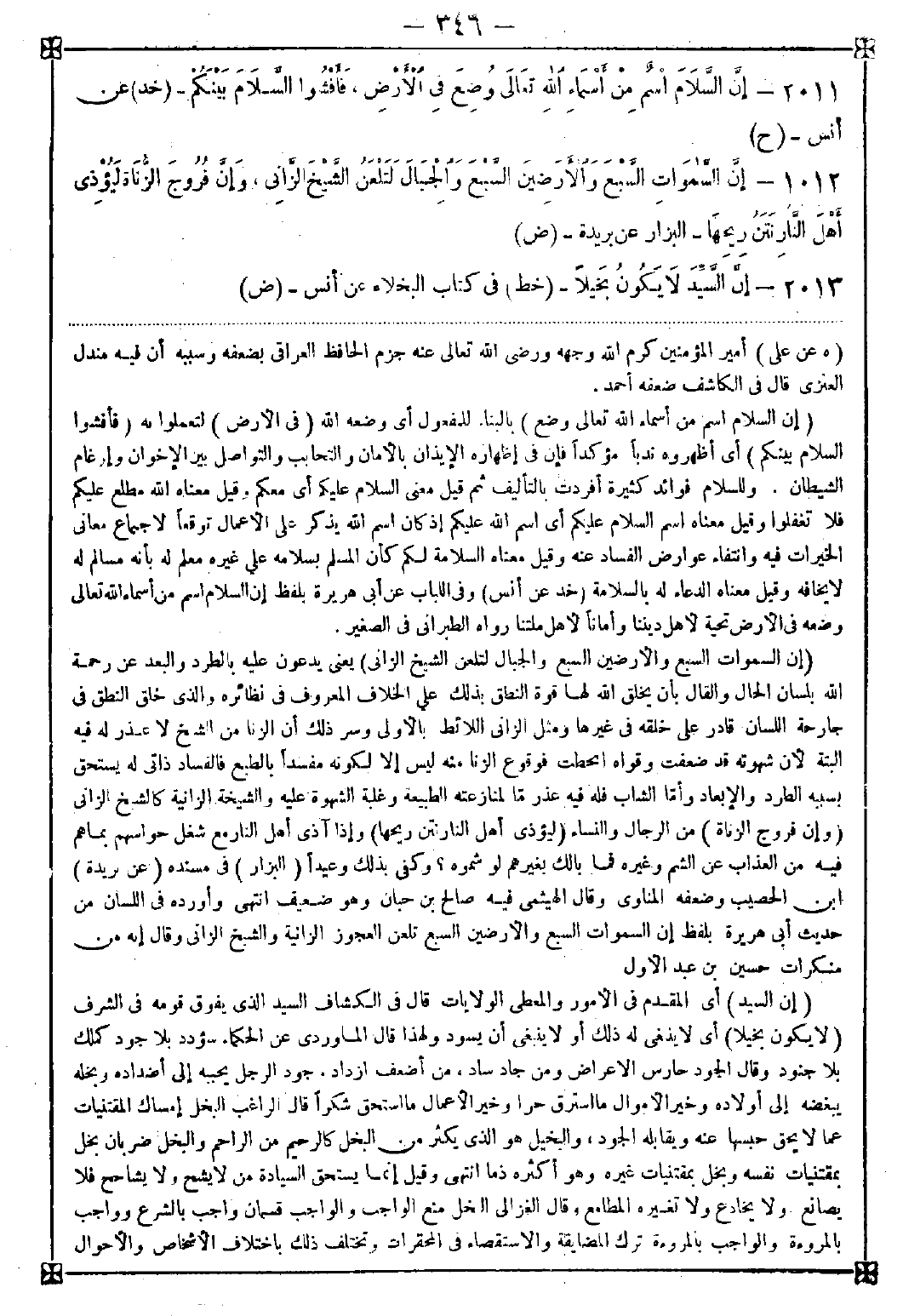 2013 - (إن السيد) أي المقدم في الأمور والمعطى الولايات قال في الكشاف: السيد الذي يفوق قومه في الشرف (لا يكون بخيلا) أي لا ينبغي له ذلك أو لا ينبغي أن يسود ولهذا قال الماوردي عن الحكماء سؤدد بلا جود كملك بلا جنود وقال الجود حارس الأعراض ومن جاد ساد ومن أضعف ازداد وجود الرجل يحببه إلى أضداده وبخله يبغضه إلى أولاده وخير الأموال ما استرق حرا وخير الأعمال ما استحق شكرا قال الراغب: البخل إمساك المقتنيات عما لا يحق حبسها عنه ويقابله الجود والبخيل هو الذي يكثر من البخل كالرحيم من الراحم والبخل ضربان بخل بمقتنيات نفسه وبخل بمقتنيات غيره وهو أكثره ذما انتهى وقيل إنما يستحق السيادة من لا يشح ولا يشاحح فلا يصانع ولا يخادع ولا تغيره المطامع وقال الغزالي: البخل منع الواجب والواجب قسمان واجب بالشرع وواجب بالمروءة والواجب بالمروءة ترك المضايقة والاستقصاء في المحقرات ويختلف ذلك باختلاف الأشخاص والأحوال -[347]- فمن أدى واجب الشرع وواجب المروءة اللائقة به فقد برئ من البخل لكن لا يتصف بصفة الجود والسخاء ما لم يبذل زيادة على ذلك لطلب الفضيلة ونيل الدرجات