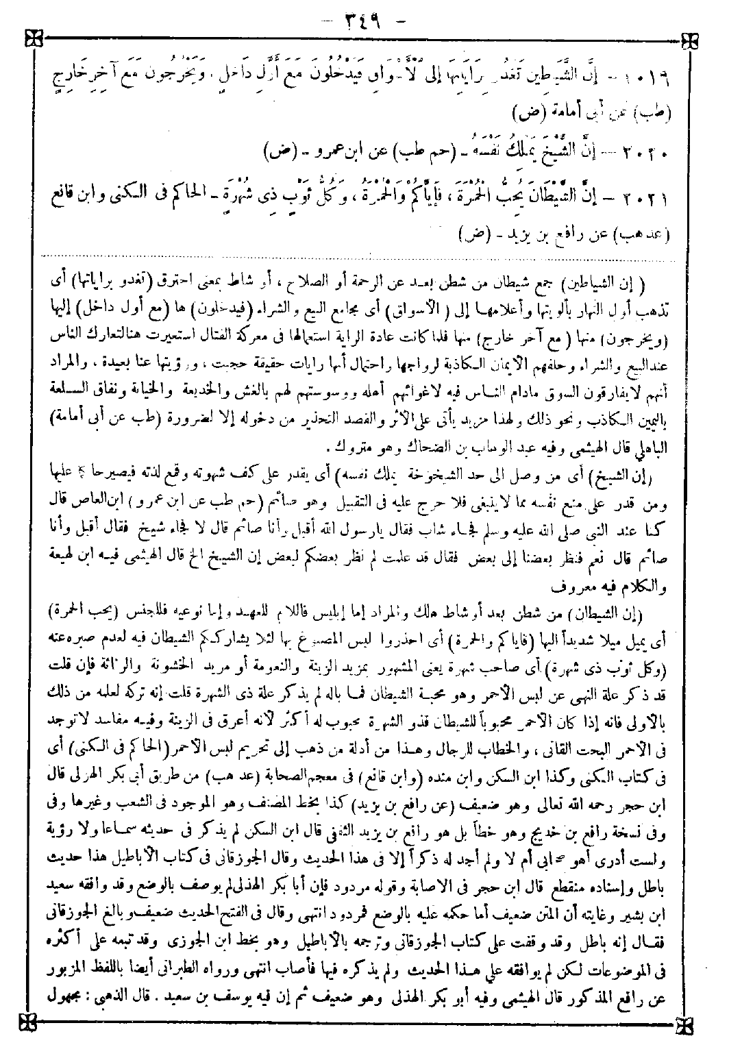 -[349]- 2019 - (إن الشياطين) جمع شيطان من شطن بعد عن الرحمة أو الصلاح أو شاط يعني احترق (تغدو براياتها) أي تذهب أول النهار بألويتها وأعلامها إلى (الأسواق) أي مجامع البيع والشراء (فيدخلون) ها (مع أول داخل) إليها (ويخرجون) منها (مع آخر خارج) منها فلما كانت عادة الراية استعمالها في معركة القتال استعيرت هنا لتعارك الناس عند البيع والشراء وحلفهم الأيمان الكاذبة لرواجها واحتمال أنها رايات حقيقية حجبت ورؤيتها عنا بعيدة والمراد أنهم لا يفارقون السوق ما دام الناس فيه لإغوائهم أهله ووسوتهم لهم بالغش والخديعة والخيانة ونفاق السلعة باليمين الكاذب ونحو ذلك ولهذا مزيد يأتي على الأثر والقصد التحذير من دخوله إلا لضرورة