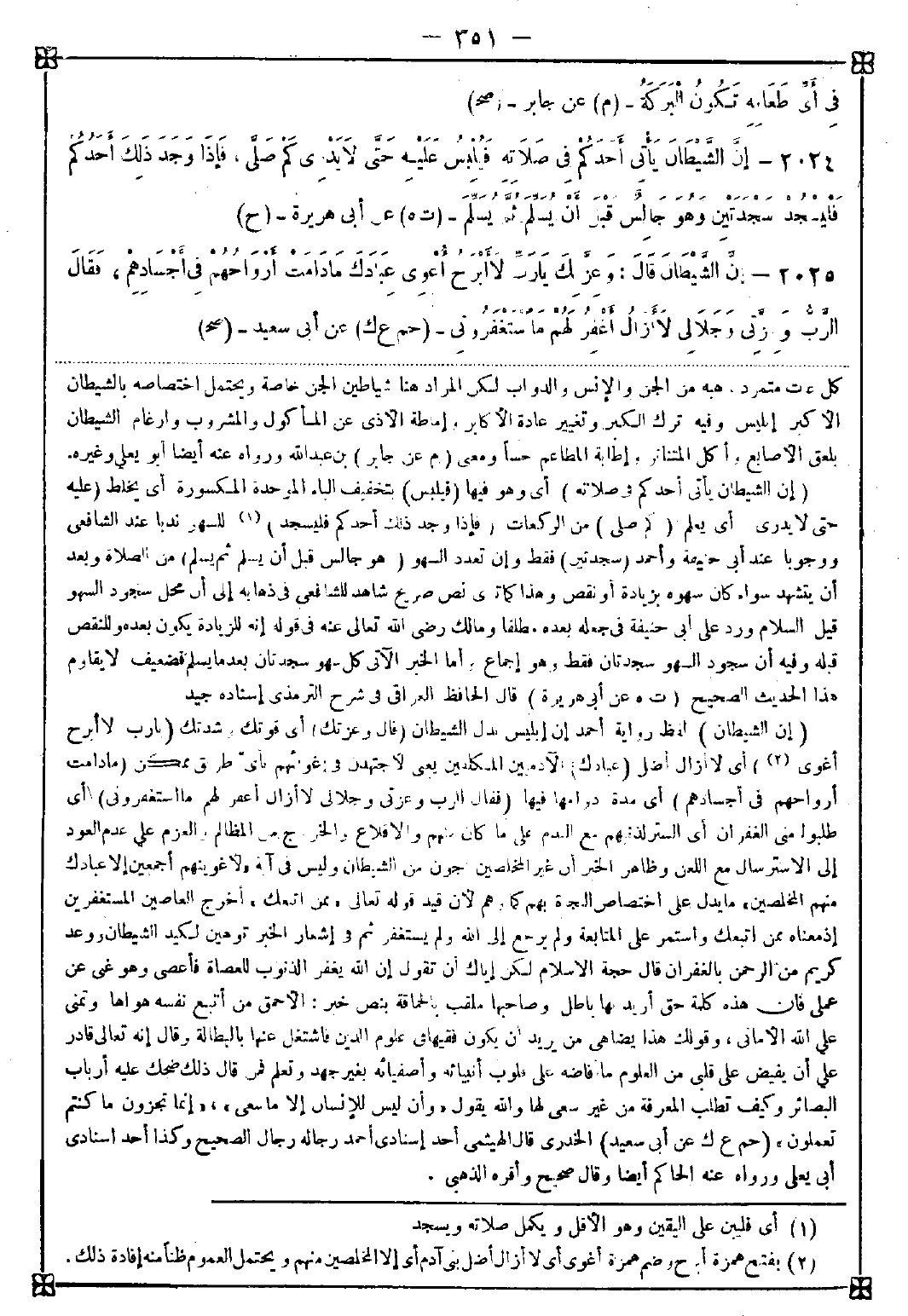 2024 - (إن الشيطان يأتي أحدكم في صلاته) أي وهو فيها (فيلبس) بتخفيف الباء الموحدة المكسورة أي يخلط (عليه حتى لا يدري) أي يعلم (كم صلى) من الركعات (فإذا وجد ذلك أحدكم فليسجد) (1) للسهو ندبا عند الشافعي ووجوبا عند أبي حنيفة وأحمد (سجدتين) فقط وإن تعدد السهو (هو جالس قبل أن يسلم ثم يسلم) من الصلاة وبعد أن يتشهد سواء كان سهوه بزيادة أو نقص وهذا كما ترى نص صريح شاهد للشافعي في ذهابه إلى أن محل سجود السهو قيل السلام ورد على أبي حنيفة في جعله بعده مطلقا ومالك رضي الله تعالى عنه في قوله للزيادة يكون بعده وللنقص قبله وفيه أن سجود السهو سجدتان فقط وهو إجماع وأما الخبر الآتي كل سهو سجدتان بعد ما يسلم فضعيف لا يقاوم هذا الحديث الصحيح