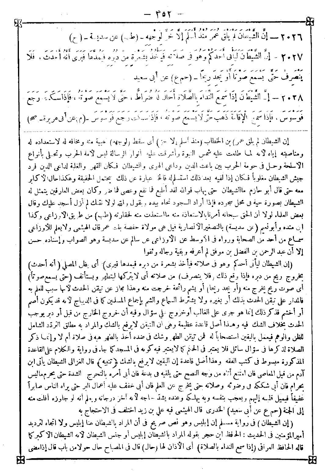 2027 - (إن الشيطان ليأتي أحدكم وهو في صلاته فيأخذ بشعرة من دبره فيمدها فيرى) أي يظن المصلي (أنه أحدث) بخروج ريح من دبره فإذا وقع ذلك (فلا ينصرف) من صلاته أي لا يتركها ليتطهر ويستأنف (حتى يسمع صوتا) أي صوت ريح يخرج منه (أو يجد ريحا) أو يشم رائحة خرجت منه وهذا مجاز عن تيقن الحدث لأنها سبب للعلم به فالمدار على تيقن الحدث بذلك أو بغيره ولا يشترط السماع والشم بإجماع المسلمين كما في الديباج لأنه قد يكون أصم أو أخشم فذكر ذلك إنما هو جري على الغالب أو خروج على سؤال وفيه أن خروج الخارج من قبل أو دبر يوجب الحدث بخلاف الشك فيه وهذا أصل قاعدة عظيمة وهي أن التيقن لا يرفع بالشك والمراد به مطلق التردد الشامل للظن والوهم فيعمل باليقين استصحابا له فمن تيقن الطهر وشك في ضده أخذ بالطهر هبه في صلاة أم لا وإنما ذكر الصلاة لذكرها في سؤال سائل فلا يعتبر في الحكم كما لا يعتبر فيه كونه في المسجد كما جاء في رواية والكلام على القاعدة المذكورة مبسوط في كتب الفقه وهذا أصل قاعدة إن اليقين لا يرفع بالشك <تنبيه> قال الغزالي: الشيطان يأتي ابن آدم من قبل المعاصي فإن امتنع أتاه من وجه النصح حتى يلقيه في بدعة فإن أبى أمره بالتحرج والشدة حتى يحرم ما ليس بحرام فإن أبى شككه في وضوئه وصلاته حتى يخرج عن العلم فإن أبى خفف عليه أعمال البر حتى يراه الناس صابرا عفيفا فيميل قلبه إليهم ويعجب بنفسه وبه يهلكه وعنده يشد حاجه لأنه آخر درجاته ويعلم أنه لو جاوزه أفلت منه إلى الجنة
