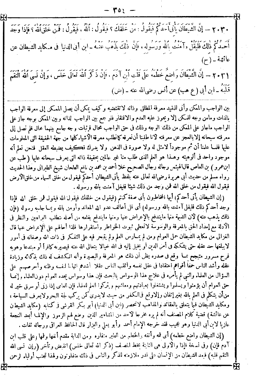 2030 - (إن الشيطان يأتي أحدكم) أيها المخاطبون بأي صفة كنتم (فيقول من خلقك فيقول الله فيقول فمن خلق الله فإذا وجد أحدكم ذلك فليقل آمنت بالله ورسوله) أي قل أخالف عدو الله المعاند وأومن بالله وبما جاء به رسوله (فإن ذلك يذهب عنه) لأن الشبهة منها ما يندفع بالإعراض عنها ومنها ما يندفع بقلعه من أصله يتطلب البراهين والنظر في الأدلة مع إمداد الحق بالمعرفة والوسوسة لا تعطي ثبوت الخواطر واستقرارها فلذا أحالهم على الإعراض عنها قال الغزالي من مكايد الشيطان حمل العوام ومن لم يمارس العلم ولم يتبحر فيه على التفكر في ذات الله وصفاته في أمور لا يبلغها حد عقله حتى يشككه في أمر الدين أو يخيل إليه في الله خيالا يتعالى الله عنه فيصير به كافرا أو مبتدعا وهو به فرح مسرور متبجح بما وقع في صدره يظن أن ذلك هو المعرفة والبصيرة وأنه انكشف له ذلك بذكائه وزيادة عقله وأشد الناس حمقا أقواهم اعتقادا في عقل نفسه وأثقب الناس عقلا أشدهم اتهاما لنفسه وظنه وأحرصهم على السؤال من العلماء والنبي لم يأمره في علاج هذا الوسواس بالبحث فإن هذا وسواس يجده العوام دون العلماء وإنما حق العوام أن يؤمنوا ويسلموا ويشتغلوا بعبادتهم ومعاشهم ويتركوا العلم للعلماء فإن العامي إذا زنى أو سرق خير له من أن يتكلم في العلم بالله بغير إتقان وإلا وقع في الكفر من حيث لا يدري كمن يركب لجة البحر ولا يعرف السباحة ومكايد الشيطان فيما يتعلق بالعقائد والمذاهب لا تحصر