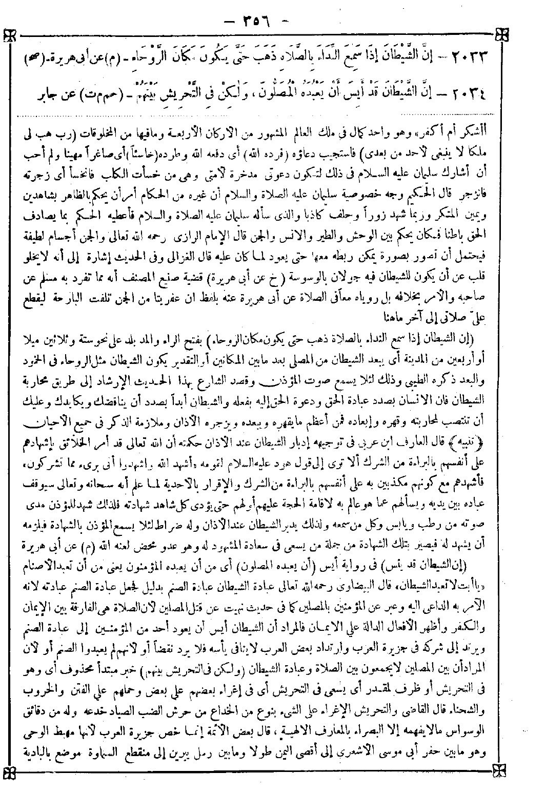 2033 - (إن الشيطان إذا سمع النداء بالصلاة ذهب حتى يكون مكان الروحاء) بفتح الراء والمد بلد على نحو ستة وثلاثين ميلا أو أربعين من المدينة أي يبعد الشيطان من المصلي بعد ما بين المكانين أو التقدير يكون الشيطان مثل الروحاء في الخمود والبعد ذكره الطيبي وذلك لئلا يسمع صوت المؤذن وقصد الشارع بهذا الحديث الإرشاد إلى طريق محاربة الشيطان فإن الإنسان بصدد عبادة الحق ودعوة الحق إليه بفعله والشيطان أبدا بصدد أن يناقضك ويكايدك وعليك أن تنتصب لمحاربته وقهره وإبعاده فمن أعظم ما يقهره ويبعده ويزجره الأذان وملازمة الذكر في جميع الأحيان <تنبيه> قال العارف ابن عربي في توجيهه إدبار الشيطان عند الأذان حكمته أن الله تعالى قد أمر الخلائق بإشهادهم على أنفسهم بالبراءة من الشرك ألا ترى إلى قول هود عليه السلام لقومه {أشهد الله وأشهدوا أني بريء مما تشركون} فأشهدهم مع كونهم مكذبين به على أنفسهم بالبراءة من الشرك والإقرار بالأحدية لما علم أنه سبحانه وتعالى سيوقف عباده بين يديه ويسألهم عما هو عالم به لإقامة الحجة عليهم أو لهم حتى يؤدي كل شاهد شهادته فلذلك شهد للمؤذن مدى صوته من رطب ويابس وكل من سمعه ولذلك يدبر الشيطان عند الأذان وله ضراط لئلا يسمع المؤذن بالشهادة فيلزمه أن يشهد له فيصير بتلك الشهادة من جملة من يسعى في سعادة المشهود له وهو عدو محض لعنه الله