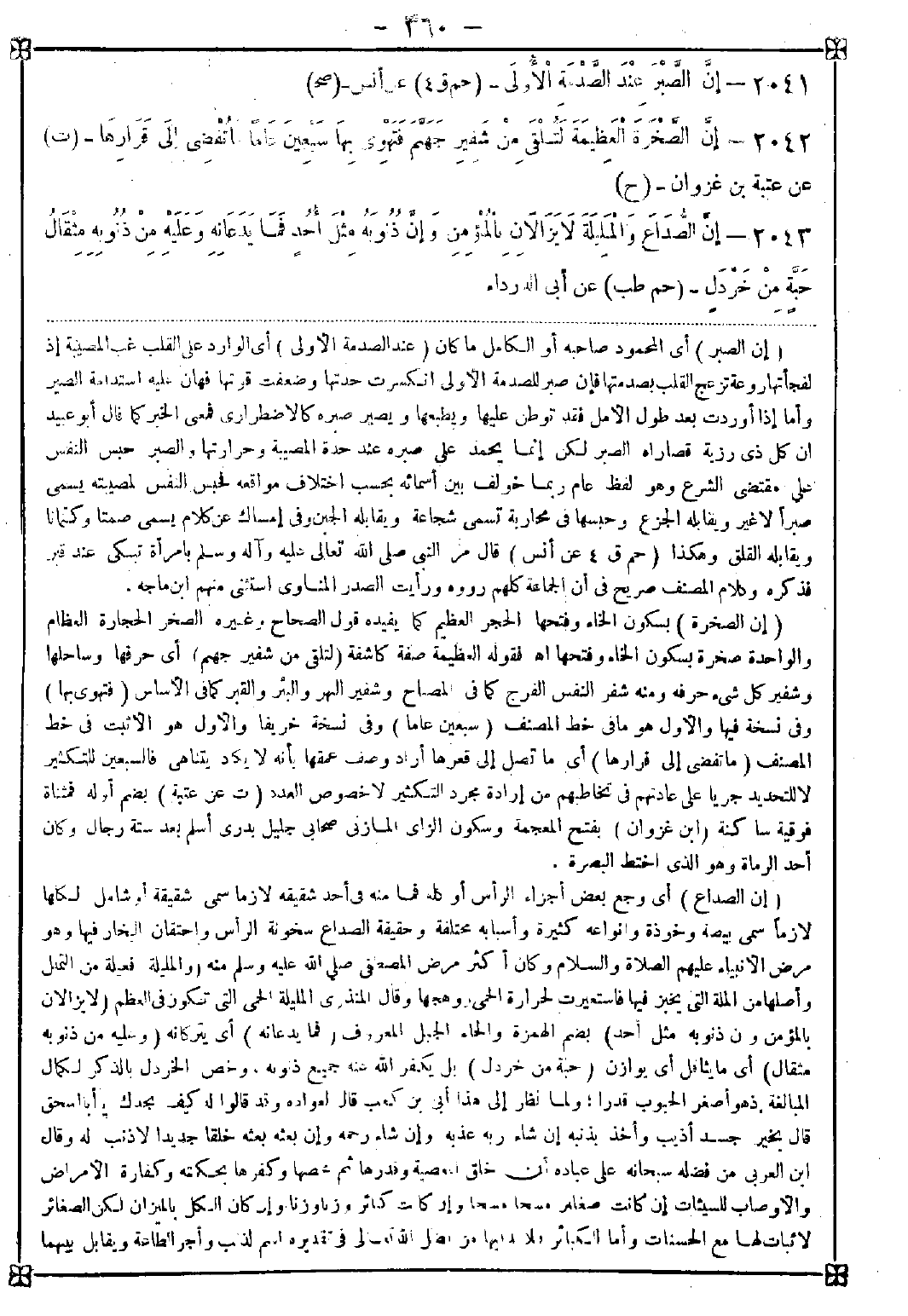 -[360]- 2041 - (إن الصبر) أي المحمود صاحبه أو الكامل ما كان (عند الصدمة الأولى) أي الوارد على القلب غب المصيبة إذ لفجأتها روعة تزعج القلب بصدمتها فإن صبر للصدمة الأولى انكسرت حدتها وضعفت قوتها فهان عليه استدامة الصبر وأما إذا أوردت بعد طول الأمل فقد توطن عليها ويطبعها ويصير صبره كالاضطراري فمعنى الخبر كما قال أبو عبيد إن كل ذي رزية قصاراه الصبر لكن إنما يحمد على صبره عند حدة المصيبة وحرارتها والصبر حبس النفس على مقتضى الشرع وهو لفظ عام ربما خولف بين أسمائه بحسب اختلاف مواقعه فحبس النفس لمصيبته يسمى صبرا لا غير ويقابله الجزع وحبسها في محاربة تسمى شجاعة ويقابله الجبن في إمساك عن كلام يسمى صمتا وكتمانا ويقابله القلق وهكذا
