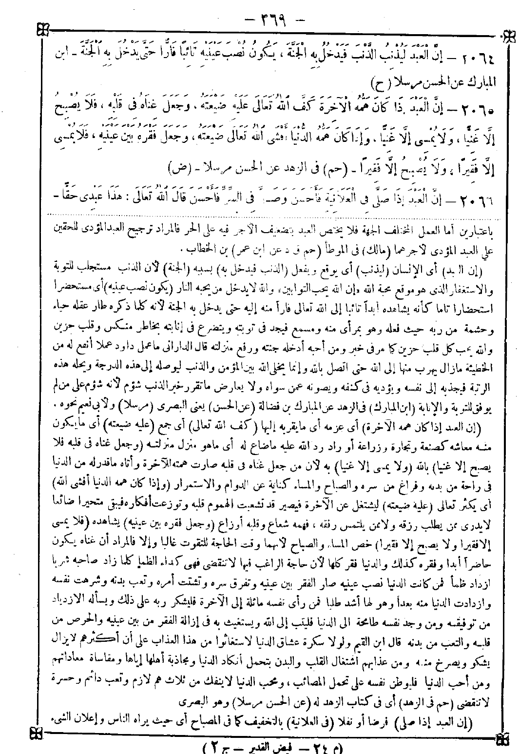 2065 - (إن العبد إذا كان همه الآخرة) أي عزمه أي ما يقربه إليها (كف الله تعالى) أي جمع (عليه ضيعته) أي ما يكون منه معاشه كصنعة وتجارة وزراعة أو راد رد الله عليه ما ضاع له أي ما هو منزل منزلته (وجعل غناه في قلبه فلا يصبح إلا غنيا) بالله (ولا يمسي إلا غنيا) به لأن من جعل غناه في قلبه صارت همته للآخرة وأتاه ما قدر له من الدنيا في راحة من بدنه وفراغ من سره والصباح والمساء كناية عن الدوام والاستمرار (وإذا كان همه الدنيا أفشى الله) أي يكثر تعالى (عليه ضيعته) ليشتغل عن الآخرة فيصير قد تشعبت الهموم قلبه وتوزعت أفكاره فيبقى متحيرا ضائعا لا يدري ممن يطلب رزقه ولا ممن يلتمس رفقه فهمه شعاع وقلبه أوزاع (جعل فقره بين عينيه) يشاهده (فلا يمسي إلا فقيرا ولا يصبح إلا فقيرا) خص المساء والصباح لأنهما وقت الحاجة للتقوت غالبا وإلا فالمراد أن غناه يكون حاضرا أبدا وفقره كذلك والدنيا فقر كلها لأن حاجة الراغب فيها لا تنقضي فهي كداء الظمأ كلما زاد صاحبه شربا ازداد ظمأ فمن كانت الدنيا نصب عينيه صار الفقر بين عينيه وتفرق سره وتشتت أمره وتعب بدنه وشرهت نفسه وازدادت الدنيا منه بعدا وهو لها أشد طلبا فمن رأى نفسه مائلة إلى الآخرة فليشكر ربه على ذلك ويسأله الازدياد من توفيقه ومن وجد نفسه طامحة إلى الدنيا فليتب إلى الله ويستغيث به في إزالة الفقر من بين عينيه والحرص من قلبه والتعب من بدنه. قال ابن القيم: ولولا سكرة عشاق الدنيا لاستغاثوا من هذا العذاب على أن أكثرهم لا يزال يشكو ويصرخ منه ومن عذابهم اشتغال القلب والبدن بتحمل أنكاد الدنيا ومجاذبة أهلها إياها ومقاساة معاداتهم ومن أحب الدنيا فليوطن نفسه على تحمل المصائب ومحب الدنيا لا ينفك من ثلاث هم لازم وتعب دائم وحسرة لا تنقضي