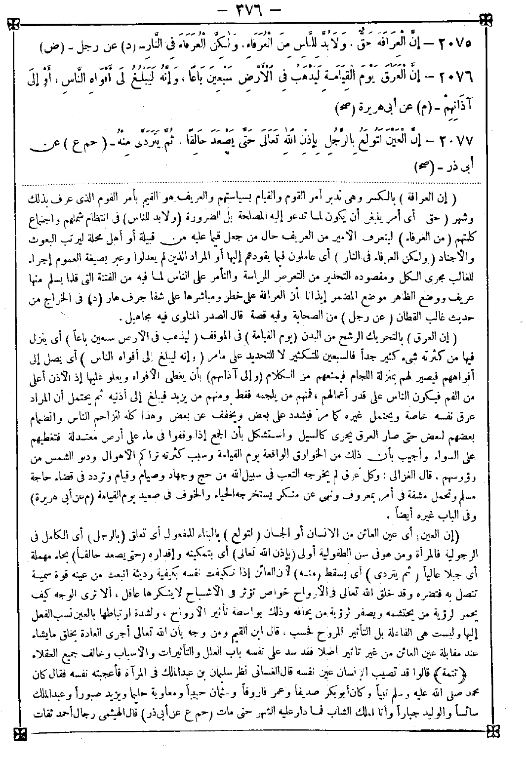 2076 - (إن العرق) بالتحريك الرشح من البدن (يوم القيامة) في الموقف (ليذهب في الأرض سبعين باعا) أي ينزل فيها من كثرته شيء كثير جدا فالسبعين للتكثير لا للتحديد على ما مر (وإنه ليبلغ إلى أفواه الناس) أي يصل إلى أفواههم فيصير لهم بمنزلة اللجام فيمنعهم من الكلام (وإلى آذانهم) بأن يغطي الأفواه ويعلو عليها إذ الأذن أعلى من الفم فيكون الناس على قدر أعمالهم فمنهم من يلجمه فقط ومنهم من يزيد فيبلغ إلى أذنيه ثم يحتمل أن المراد عرق نفسه خاصة ويحتمل غيره كما مر فيشدد على بعض ويخفف عن بعض وهذا كله لتزاحم الناس وانضمام بعضهم لبعض حتى صار العرق يجري كالسيل واستشكل بأن الجمع إذا وقفوا في ماء على أرض معتدلة فتغطيهم على السواء وأجيب بأن ذلك من الخوارق الواقعة يوم القيامة وسبب كثرته تراكم الأهوال ودنو الشمس من رؤوسهم. قال الغزالي: وكل عرق لم يخرجه التعب في سبيل الله من حج وجهاد وصيام وقيام وتردد في قضاء حاجة مسلم وتحمل مشقة في أمر بمعروف ونهي عن منكر يستخرجه الحياء والخوف في صعيد يوم القيامة