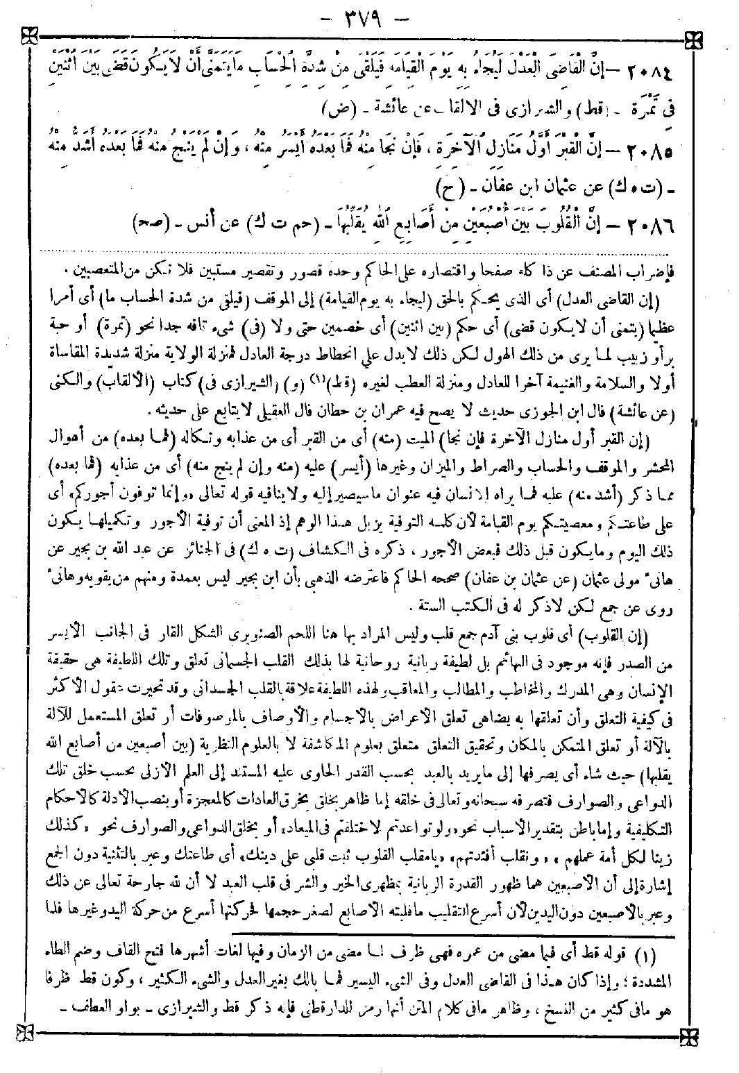 2086 - (إن القلوب) أي قلوب بني آدم جمع قلب وليس المراد بها هنا اللحم الصنوبري الشكل القار في الجانب الأيسر من الصدر فإنه موجود في البهائم بل لطيفة ربانية روحانية لها بذلك القلب الجسماني تعلق وتلك اللطيفة هي حقيقة الإنسان وهي المدرك والمخاطب والمطالب والمعاقب ولهذه اللطيفة علاقة بالقلب الجسداني وقد تحيرت عقول الأكثر في كيفية التعلق وأن تعلقها به يضاهي تعلق الأعراض بالأجسام والأوصاف بالموصوفات أو تعلق المستعمل للآلة بالآلة أو تعلق المتمكن بالمكان وتحقيق التعلق متعلق بعلوم المكاشفة لا بالعلوم النظرية (بين أصبعين من أصابع الله يقلبها) حيث شاء أي يصرفها إلى ما يريد بالعبد بحسب القدر الحاوي عليه المستند إلى العلم الأزلي بحسب خلق تلك الدواعي والصوارف فتصرفه سبحانه وتعالى في خلقه إما ظاهر بخلق يخرق العادات كالمعجزة أو بنصيب الأدلة كالأحكام التكليفية وإما باطن بتقدير الأسباب نحو {ولو تواعدتم لاختلفتم في الميعاد} أو يخلق الدواعي والصوارف نحو {كذلك زينا لكل أمة عملهم} {ونقلب أفئدتهم} " يا مقلب القلوب ثبت قلبي على دينك " أي طاعتك وعبر بالتثنية دون الجمع إشارة إلى أن الأصبعين هما ظهور القدرة الربانية بمظهري الخير والشر في قلب العبد لا أن لله جارحة تعالى عن ذلك وعبر بالأصبعين دون اليدين لأن أسرع التقليب ما قلبته الأصابع لصغر حجمها فحركتها أسرع من حركة اليد وغيرها فلما -[380]- كان تقليب الله قلوب عباده أسرع شيء خاطب المصطفى صلى الله عليه وسلم العرب بما تعقل قال الكمال ابن أبي شريف وقوله كيف يشاء نصب على المفعول المطلق من قوله يقلبها والتقدير تقليبا يريده وهذا من أحاديث الصفات وللناس في تلقيتها مذهبان أحدهما أن الإيمان بها وجب كالإيمان بمتشابه القرآن والبحث فيها بدعة وعليه أكثر السلف الثاني أن البحث عنها واجب وتأويلها بنحو ما تقرر متعين فرارا من التعطيل وإمام هذه الطائفة المرتضى والحبر ومن على قدمهما من فقهاء الصدر الأول لأن الله سبحانه لم ينزل من المتشابه ما أنزل إلا ليعلم ورسوله لم يقل ما قال إلا ليفهم وبمعرفة المتشابه يتميز الفاضل من المفضول والعالم من المتعلم والحكيم من المتعجرف ومن آمن بالأخبار على ما جاءت به حيث ألبس عليه كنه معرفتها لا تجب عليه أن يردها رد منكر لها بل يؤمن ويسلم ويكلها إلى الله ورد متشابه التنزيل والسنة طريق هين يستوي فيه العالم والجاهل والسفيه والعاقل وإنما يظهر الفضل بالبحث واستخراج الحكمة والحمل على ما يوافق الأصول والعقول