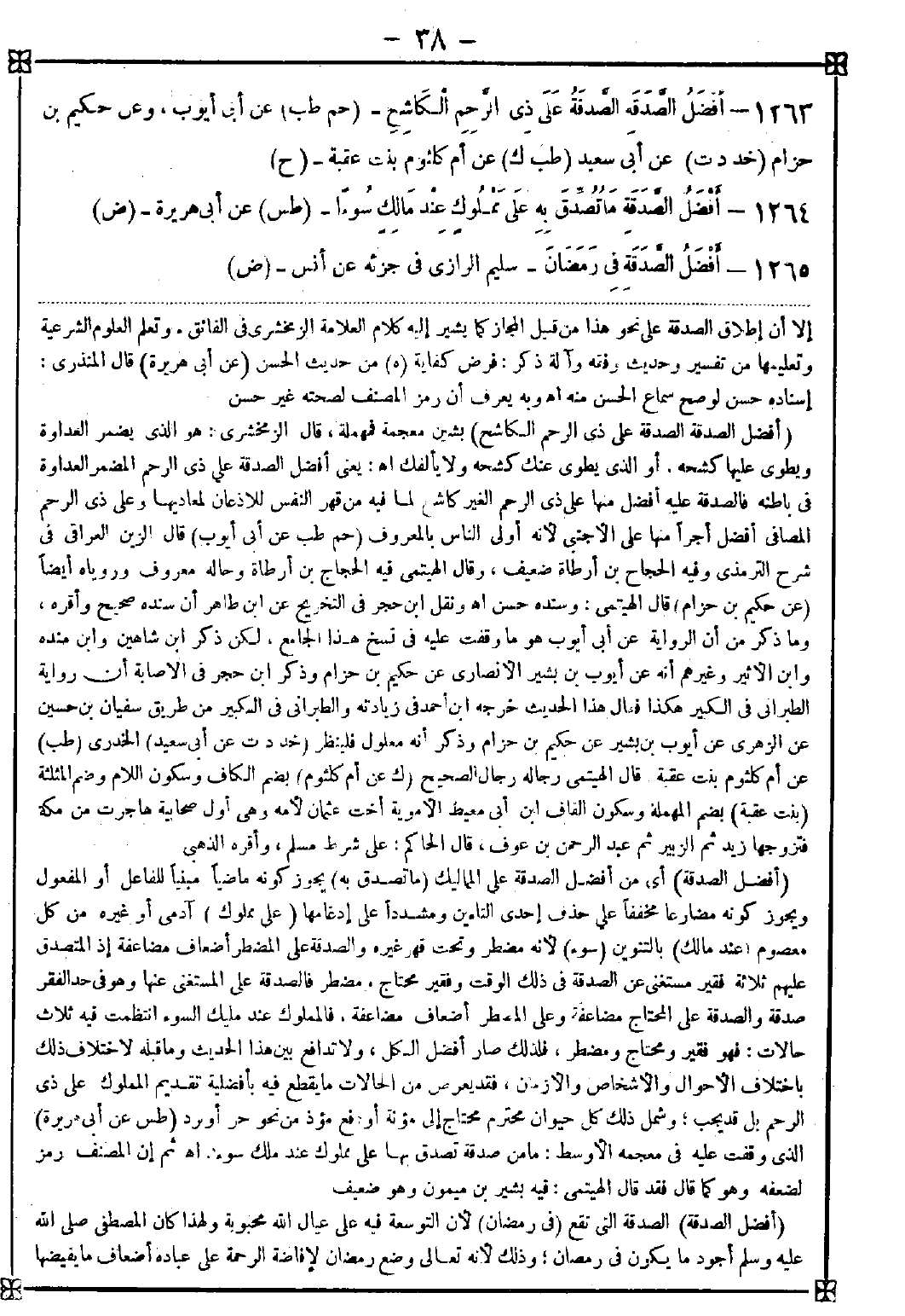 1264 - (أفضل الصدقة) أي من أفضل الصدقة على المماليك (ما تصدق به) يجوز كونه ماضيا مبنيا للفاعل أو المفعول ويجوز كونه مضارعا مخففا على حذف إحدى التاءين ومشددا على إدغامها (على مملوك) آدمي أو غيره من كل معصوم (عند مالك) بالتنوين (سوء) لأنه مضطر وتحت قهر غيره والصدقة على المضطر أضعاف مضاعفة إذ المتصدق عليهم ثلاثة فقير مستغني عن الصدقة في ذلك الوقت وفقير محتاج مضطر فالصدقة على المستغني عنها وهو في حد الفقر صدقة والصدقة على المحتاج مضاعفة وعلى المضطر أضعاف مضاعفة فالمملوك عند مليك السوء انتظمت فيه ثلاث حالات: فهو فقير ومحتاج ومضطر فلذلك صار أفضل الكل ولا تدافع بين هذا الحديث وما قبله لاختلاف ذلك باختلاف الأحوال والأشخاص والأزمان فقد يغرض من الحالات ما يعرض فيه بأفضلية تقديم المملوك على ذي الرحم بل قد يجب وشمل ذلك كل حيوان محترم محتاج إلى مؤنة أو دفع مؤذ من نحو حر أو برد