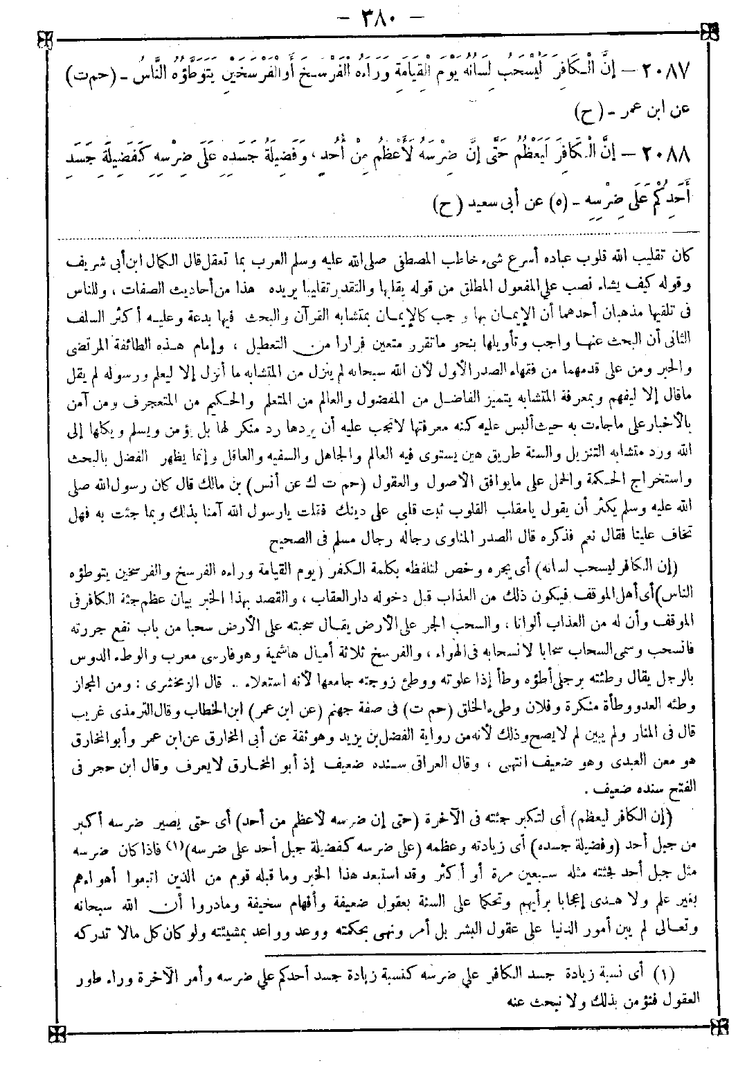 2088 - (إن الكافر ليعظم) أي لتكبر جثته في الآخرة (حتى إن ضرسه لأعظم من أحد) أي حتى يصير ضرسه أكبر من جبل أحد (وفضيلة جسده) أي زيادته وعظمه (على ضرسه كفضيلة جبل أحد على ضرسه) (1) فإذا كان ضرسه مثل جبل أحد فجثته مثله سبعين مرة أو أكثر وقد استبعد هذا الخبر وما قبله قوم من الذين اتبعوا أهواءهم بغير علم ولا هدى إعجابا برأيهم وتحكما على السنة بعقول ضعيفة وأفهام سخيفة وما دروا أن الله سبحانه وتعالى لم يبن أمور الدنيا على عقول البشر بل أمر ونهى بحكمته ووعد وواعد بمشيئته ولو كان كل ما لا تدركه -[381]- العقول غير مقبول لاستحالت أكثر واجبات الشرائع ألا ترى أنه تعالى أوجب غسل جميع البدن من المني وهو طاهر وأوجب غسل الأعضاء الأربعة من الغائط فقط وهو نجس منتن وأوجب بخروج يسير ما أوجب بخروج ريح يسير فبأي عقل يساوي ما لا عين له ما له عين قائمة بمحل واحد وأوجب قطع يد السارق في ربع دينار وقطعه في مئة ألف قنطار والقطع فيهما سواء وأوجب للأم الثلث فإذا كان للولد أخوة فالسدس من غير أن يرث الإخوة من ذلك شيئا فبأي عقل يدرك هذا إلا تسليما للشارع؟ وهذا باب واسع يطول تتبعه وإذا كان هذا في أمور الدنيا فما بالك بأمر الآخرة التي ليس معها شيء على نمط ما في الدنيا ولا يشبهه إلا في مجرد الاسم