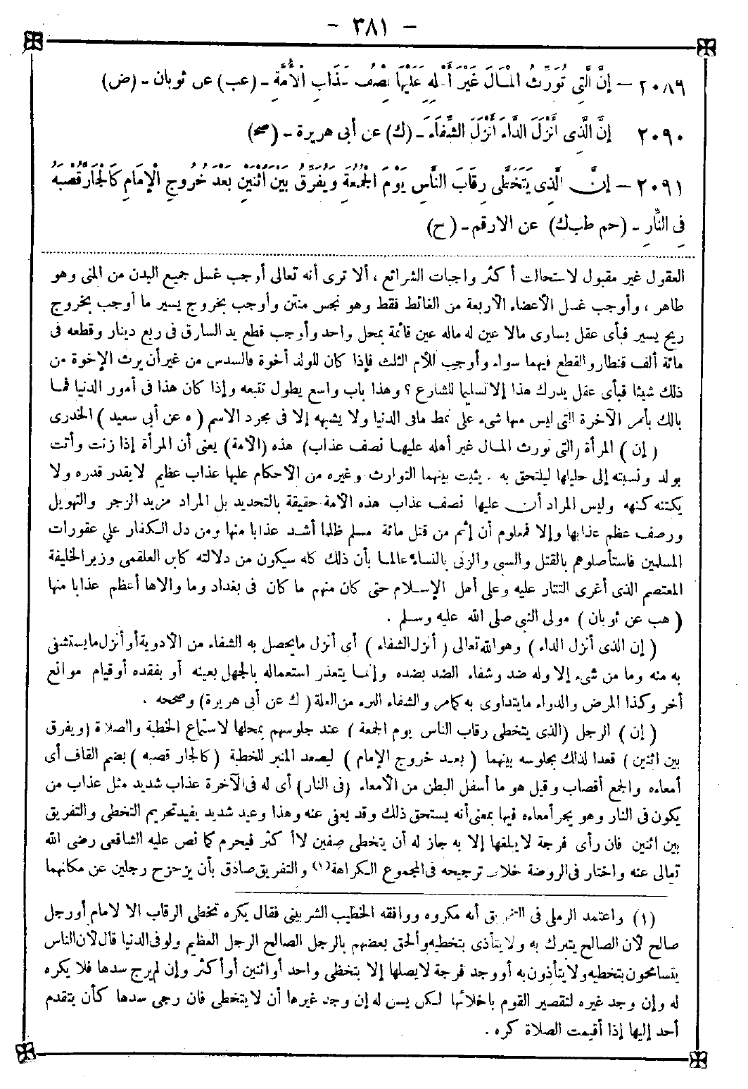 2089 - (إن) المرأة (التي تورث المال غير أهله عليها نصف عذاب) هذه (الأمة) يعني المرأة إذا زنت وأتت بولد ونسبته إلى حليلها ليلحق به ويثبت بينهما التوارث وغيره من الأحكام عليها عذاب عظيم لا يقدر قدره ولا يكتنه كنهه وليس المراد أن عليها نصف عذاب هذه الأمة حقيقة بالتحديد بل المراد مزيد الزجر والتهويل ووصف عظيم عذابها وإلا فمعلوم أن إثم من قتل مئة مسلم ظلما أشد عذابا منها ومن دل الكفار على عقورات المسلمين فاستأصلوهم بالقتل والسبي والزنى بالنساء عالما بأن ذلك كله سيكون من دلالته كابن العلقمي وزير الخليفة المعتصم الذي أغرى التتار عليه وعلى أهل الإسلام حتى كان منهم ما كان في بغداد وما والاها أعظم عذابا منها