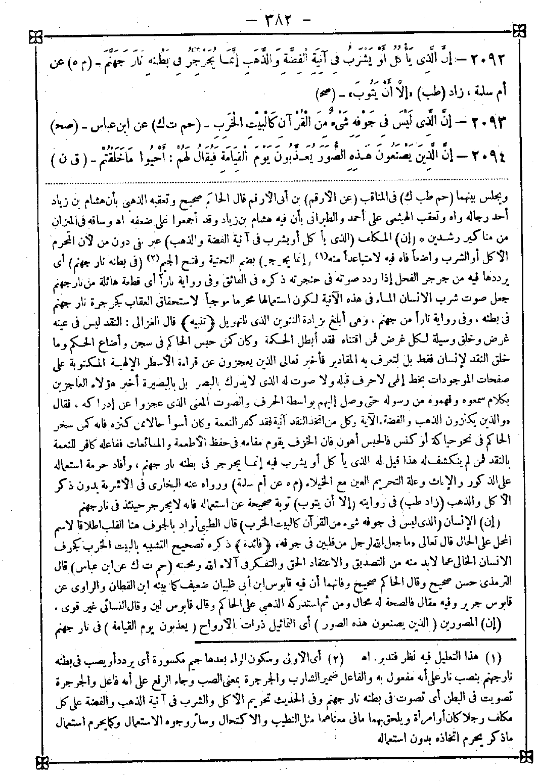 2092 - (إن) المكلف (الذي يأكل أو يشرب في آنية الفضة والذهب) عبر بفي دون من لأن المحرم الأكل أو الشرب واضعا فاه فيه لا متباعدا منه (1) (إنما يجرجر) بضم التحتية وفتح الجيم (2) (في بطنه نار جهنم) أي يرددها فيه من جرجر الفحل إذ ردد صوته في حنجرته ذكره في الفائق وفي رواية نارا أي قطعة هائلة من نار جهنم جعل صوت شرب الإنسان الماء في هذه الآنية لكون استعمالها محرما موجبا لاستحقاق العقاب كجرجرة نار جهنم في بطنه وفي رواية نارا من جهنم وهي أبلغ بزيادة التنوين الذي للتهويل