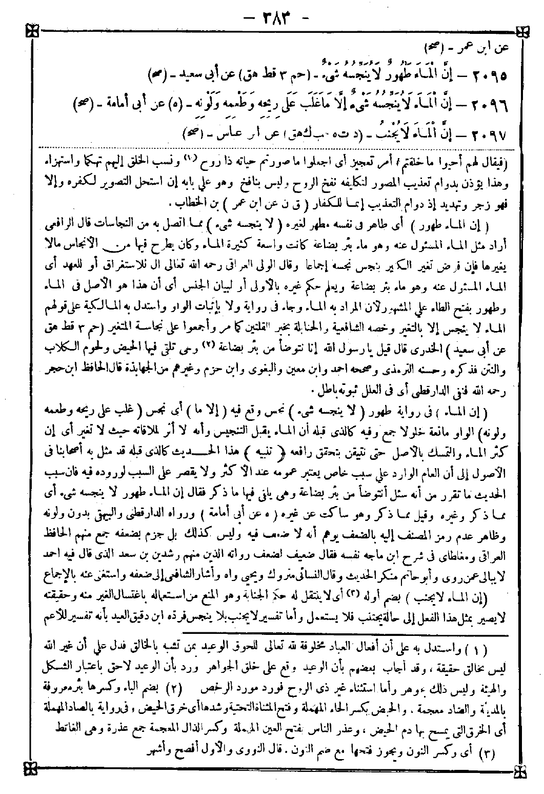 2096 - (إن الماء) في رواية طهور (لا ينجسه شيء) نجس وقع فيه (إلا ما) أي نجس (غلب على ريحه وطعمه ولونه) الواو مانعة خلو لا جمع وفيه كالذي قبله أن الماء يقبل التنجيس وأنه لا أثر لملاقاته حيث لا تغير أي إن كثر الماء والتمسك بالأصل حتى نتيقن بتحقق رافعه <تنبيه> هذا الحديث كالذي قبله قد مثل به من أصحابنا في الأصول إلى أن العام الوارد على سبب خاص يعتبر عمومه عند الأكثر ولا يقصر على السبب لوروده فيه فإن سبب الحديث ما تقرر من أنه سئل أنتوضأ من بئر بضاعة وهي يلقى فيها ما ذكر فقال إن الماء طهور لا ينجسه شيء أي مما ذكر وغيره وقيل مما ذكر وهو ساكت عن غيره