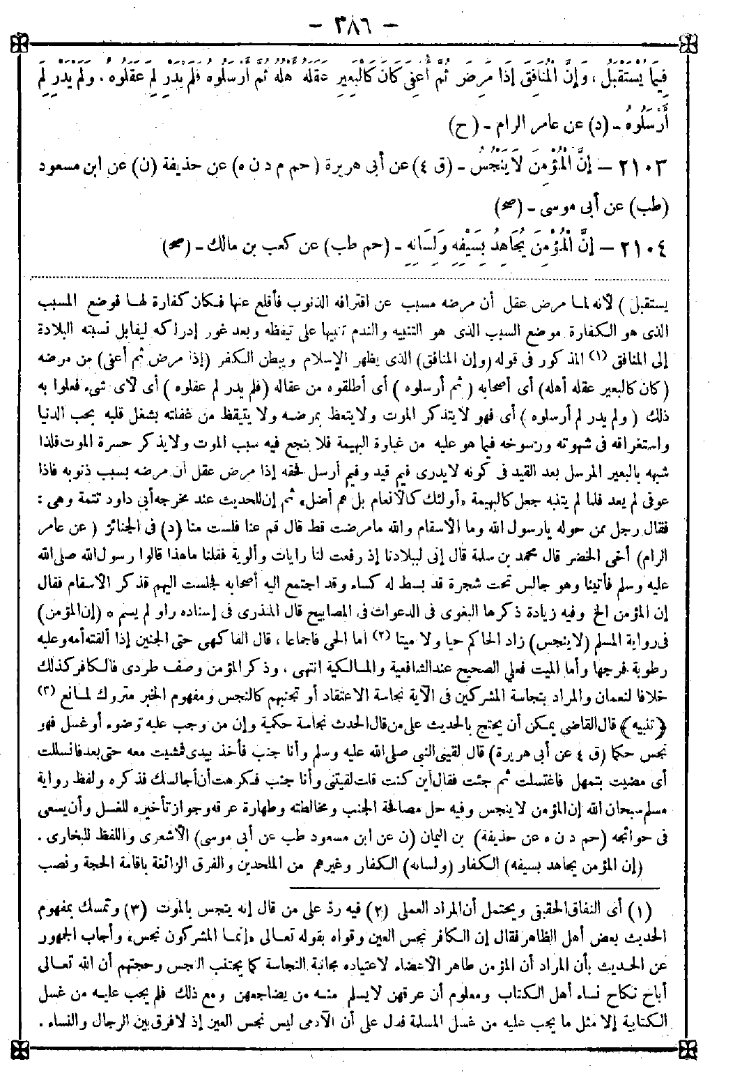 2103 - (إن المؤمن) في رواية المسلم (لا ينجس) زاد الحاكم حيا ولا ميتا (1) أما الحي فإجماعا قال الفاكهي حتى الجنين إذا ألقته أمه وعليه رطوبة فرجها وأما الميت فعلي الصحيح عند الشافعية والمالكية انتهى وذكر المؤمن وصف طردي فالكافر كذلك خلافا لنعمان والمراد بنجاسة المشركين في الآية نجاسة الاعتقاد أو تجنبهم كالنجس ومفهوم الخبر متروك لمانع (2)