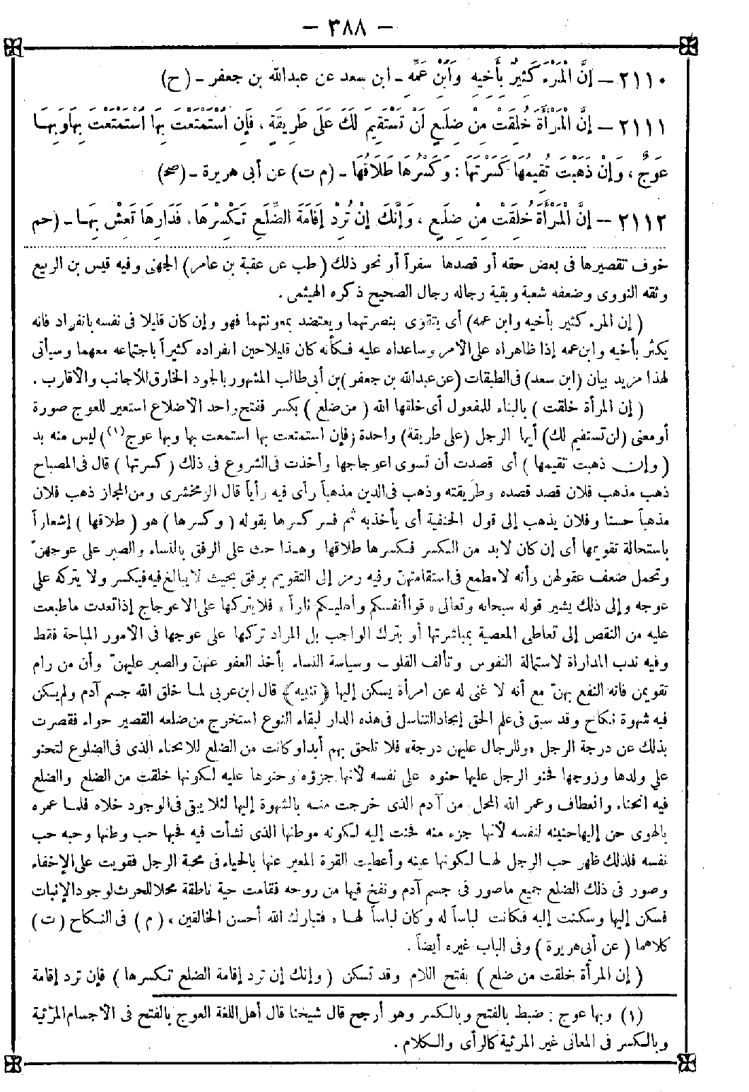 2111 - (إن المرأة خلقت) بالبناء للمفعول أي خلقها الله (من ضلع) بكسر ففتح واحد الأضلاع استعير للعوج صورة أو معنى (لن تستقيم لك) أيها الرجل (على طريقة) واحدة (فإن استمتعت بها استمتعت بها وبها عوج) (1) ليس منه بد (وإن ذهبت تقيمها) أي قصدت أن تسوي اعوجاجها وأخذت في الشروع في ذلك (كسرتها) قال في المصباح ذهب مذهب فلان قصد قصده وطريقته وذهب في الدين مذهبا رأى فيه رأيا قال الزمخشري: ومن المجاز ذهب فلان مذهبا حسنا وفلان يذهب إلى قول الحنفية أي يأخذ به ثم فسر كسرها بقوله (وكسرها) هو (طلاقها) إشعارا باستحالة تقويمها أي إن كان لا بد من الكسر فكسرها طلاقها وهذا حث على الرفق بالنساء والصبر على عوجهن وتحمل ضعف عقولهن وأنه لا مطمع في استقامتهن وفيه رمز إلى التقويم برفق بحيث لا يبالغ فيه فيكسر ولا يتركه على عوجه وإلى ذلك يشير قوله سبحانه وتعالى {قوا أنفسكم وأهليكم نارا} فلا يتركها على الاعوجاج إذا تعدت ما طبعت عليه من النقص إلى تعاطي المعصية بمباشرتها أو بترك الواجب بل المراد تركها على عوجها في الأمور المباحة فقط وفيه ندب المداراة لاستمالة النفوس وتألف القلوب وسياسة النساء بأخذ العفو عنهن والصبر عليهن وأن من رام تقويمهن فاته النفع بهن مع أنه لا غنى له عن امرأة يسكن إليها <تنبيه> قال ابن عربي: لما خلق الله جسم آدم ولم يكن فيه شهوة نكاح وقد سبق في علم الحق إيجاد التناسل في هذه الدار لبقاء النوع استخرج من ضلعه القصير حواء فقصرت بذلك عن درجة الرجل {وللرجال عليهن درجة} فلا تلحق بهم أبدا وكانت من الضلع للانحناء الذي في الضلوع لتحنو على ولدها وزوجها فحنو الرجل عليها حنوه على نفسه لأنها جزؤه وحنوها عليه لكونها خلقت من الضلع والضلع فيه انحناء وانعطاف وعمر الله المحل من آدم الذي خرجت منه الشهوة إليها لئلا يبقى في الوجود خلاه فلما عمره بالهوى فلذلك حن إليها حنينه على نفسه لأنها جزء منه فحنت إليه لكونه موطنها الذي نشأت فيه فحبها حب وطنها وحبه حب نفسه فلذلك ظهر حب الرجل لها لكونها عينه وأعطيت القوة المعبر عنها بالحياء في محبة الرجل فقويت على الإخفاء وصور في ذلك الضلع جميع ما صور في جسم آدم ونفخ فيها من روحه فقامت حية ناطقة محلا للحرث لوجود الإنبات فسكن إليها وسكنت إليه فكانت لباسا له وكان لباسا لها {فتبارك الله أحسن الخالقين}