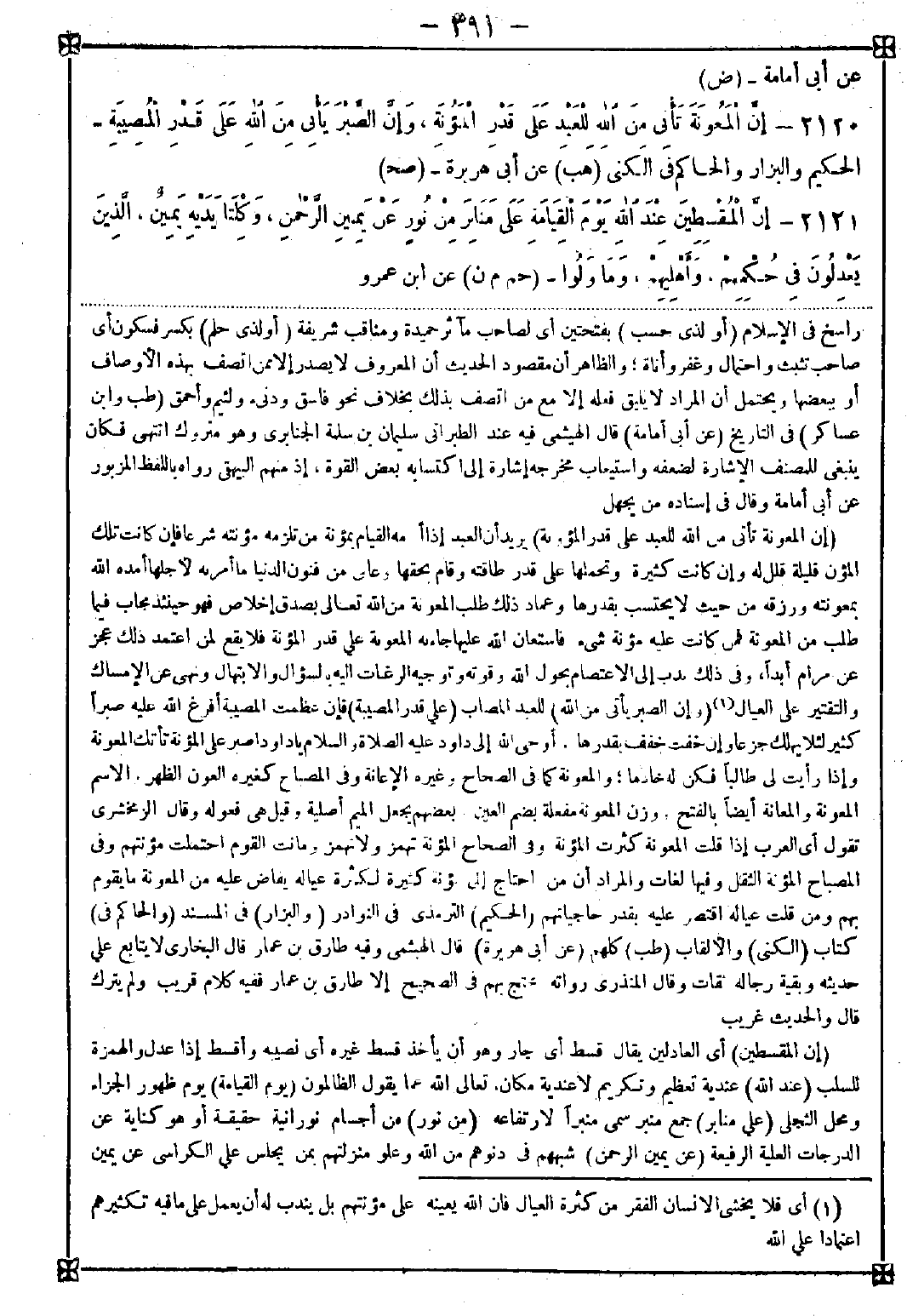 2120 - (إن المعونة تأتي من الله للعبد على قدر المؤونة) يريد أن العبد إذا أهمه القيام بمؤونة تلزمه مؤونته شرعا فإن كانت تلك المؤن قليلة قلل له وإن كانت كثيرة وتحملها على قدر طاقته وقام بحقها وعاين من فنون الدنيا ما أمر به لأجلها أمده الله بمعونته ورزقه من حيث لا يحتسب بقدرها وعماد ذلك طلب المعونة من الله تعالى بصدق إخلاص فهو حينئذ مجاب فيما طلب من المعونة فمن كانت عليه مؤونة شيء فاستعان الله عليها جاءته المعونة على قدر المؤونة فلا يقع لمن اعتمد ذلك عجز عن مرام أبدا وفي ذلك ندب إلى الاعتصام بحول الله وقوته وتوجيه الرغبات إليه بالسؤال والابتهال ونهي عن الإمساك والتقتير على العيال (1) (وإن الصبر يأتي من الله) للعبد المصاب (على قدر المصيبة) فإن عظمت المصيبة أفرغ الله عليه صبرا كثيرا لئلا يهلك جزعا وإن خفت خفف بقدرها. أوحى الله إلى داود عليه الصلاة والسلام يا داود اصبر على المؤونة تأتيك المعونة وإذا رأيت لي طالبا فكن له خادما والمعونة كما في الصحاح وغيره الإعانة وفي المصباح كغيره العون الظهر والاسم المعونة والمعانة أيضا بالفتح ووزن المعونة مفعلة بضم العين وبعضهم يجعل الميم أصلية وقيل هي فعولة وقال الزمخشري: تقول أي العرب إذا قلت المعونة كثرت المؤونة وفي الصحاح المؤونة تهمز ولا تهمز ومانت القوم احتملت مؤونتهم وفي المصباح المؤونة الثقل وفيها لغات والمراد أن من احتاج إلى مؤونة كثيرة لكثرة عياله يفاض عليه من المعونة ما يقوم بهم ومن قلت عياله اقتصر عليه بقدر حاجياتهم