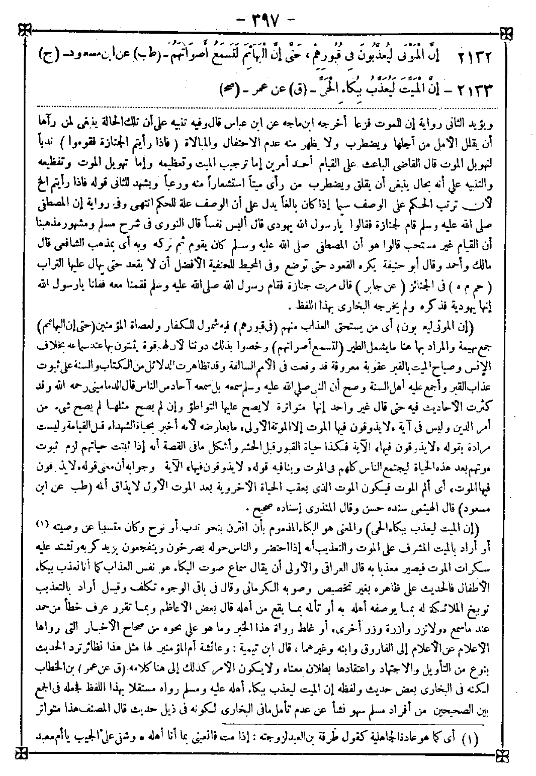 2133 - (إن الميت ليعذب ببكاء الحي) والمعنى هو البكاء المذموم بأن اقترن بنحو ندب أو نوح وكان متسببا عن وصيته (1) أو أراد بالميت المشرف على الموت والتعذيب أنه إذا احتضر والناس حوله يصرخون ويتفجعون يزيد كربه وتشتد عليه سكرات الموت فيصير معذبا به قال العراقي: والأولى أن يقال سماع صوت البكاء هو نفس العذاب كما أنا نعذب ببكاء الأطفال فالحديث على ظاهره بغير تخصيص وصوبه الكرماني وقال في باقي الوجوه تكلف وقيل أراد بالتعذيب توبيخ الملائكة له بما يوصفه أهله به أو تألمه بما يقع من أهله قال بعض الأعاظم وبما تقرر عرف خطأ من حمد عندما سمع {ولا تزر وازرة وزر أخرى} أو غلط رواة هذا الخبر وما هو على نحوه من صحاح الأخبار التي رواها الأعلام عن الأعلام إلى الفاروق وابنه وغيرهما قال ابن تيمية: وعائشة أم المؤمنين لها مثل هذا نظائر ترد الحديث بنوع من التأويل والاجتهاد واعتقادها بطلان معناه ولا يكون الأمر كذلك إلى هنا كلامه