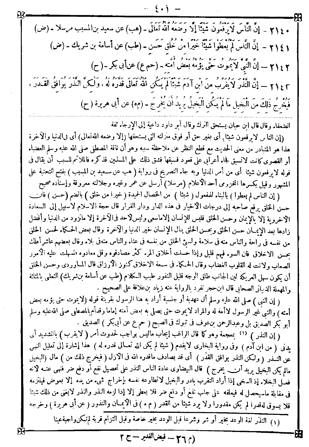 2143 - (إن النذر) (1) بمعجمة وهو كما قال الراغب إيجاب ما ليس بواجب لحدوث أمر (لا يقرب) بالتشديد أي يدني (من ابن آدم) وفي رواية البخاري لا يقدم (شيئا لم يكن الله تعالى قدره له) هذا إشارة إلى تعليل النهي عن النذر (ولكن النذر يوافق القدر) أي قد يصادف ما قدره الله في الأزل (فيخرج ذلك من) مال (البخيل ما لم يكن البخيل يريد أن يخرج) قال البيضاوي: عادة الناس النذر على تحصيل نفع أو دفع ضر فنهى عنه لأنه فعل البخلاء إذ السخي إذا أراد التقرب بادر والبخيل لا تطاوعه نفسه بإخراج شيء من يده إلا بعوض فيلتزمه في مقابلة ما سيحصل له فيعلقه على جلب نفع أو دفع ضر فلا يعطي إلا إذا لزمه النذر والنذر لا يغني من ذلك شيئا فلا يسوق له قدرا لم يكن مقدورا ولا يرد شيئا من القدر