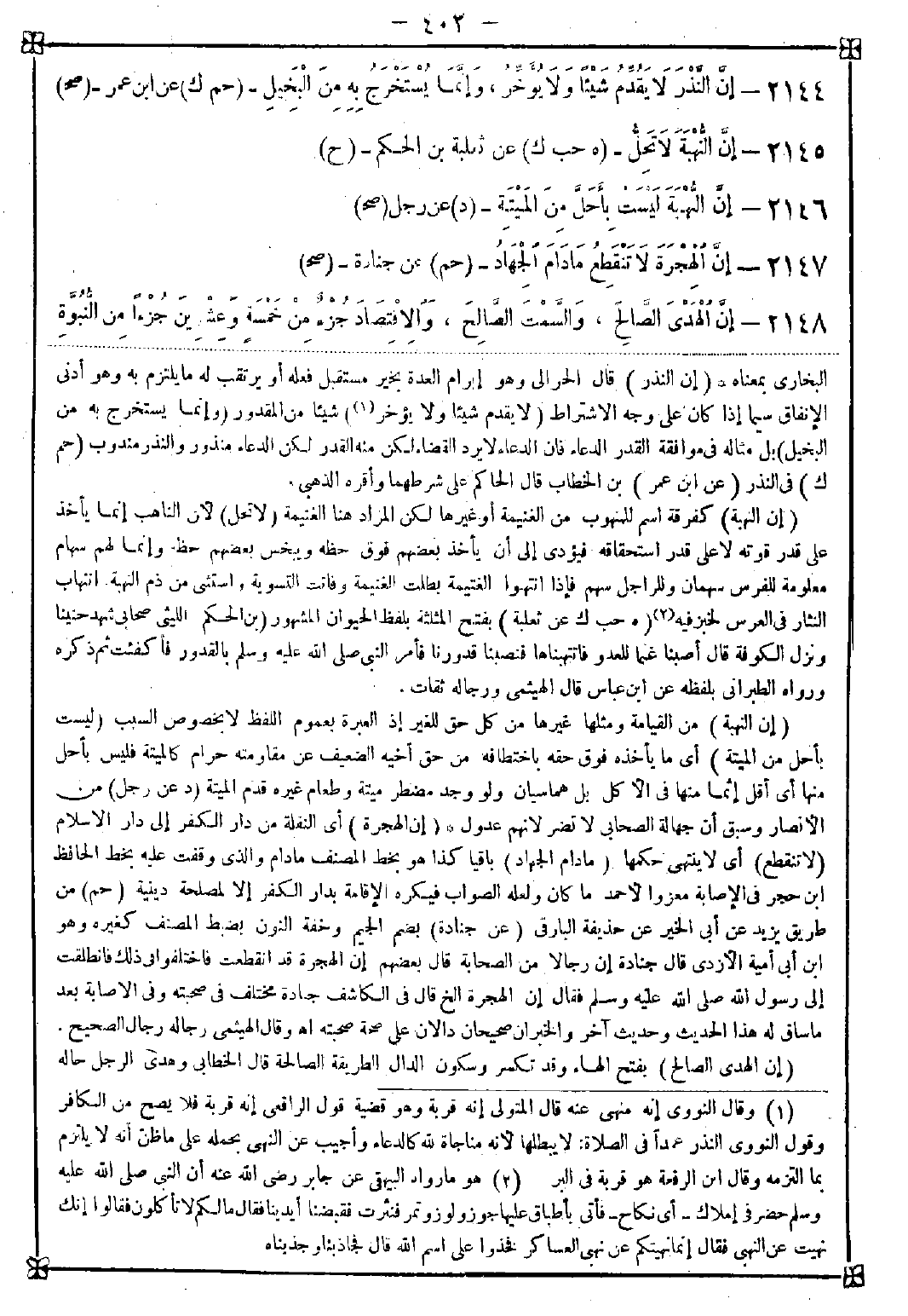 2146 - (إن النهبة) من القيامة ومثلها غيرها من كل حق للغير إذ العبرة بعموم اللفظ لا بخصوص السبب (ليست بأحل من الميتة) أي ما يأخذه فوق حقه باختطافه من حق أخيه الضعيف عن مقاومته حرام كالميتة فليس بأحل منها أي أقل إثما منها في الأكل بل هما سيان ولو وجد مضطر ميتة وطعام غيره قدم الميتة